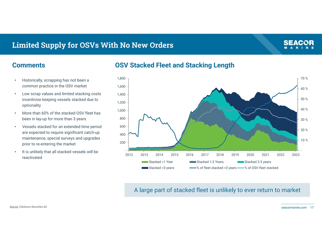 Limited Supply for OSVs With No New Orders Comments OSV Stacked Fleet and Stacking Length 1,800 70 % • Historically, scrapping has not been a common practice in the OSV market 1,600 60 % • Low scrap values and limited stacking costs 1,400 50 % incentivize keeping vessels stacked due to 1,200 optionality 40 % 1,000 • More than 60% of the stacked OSV fleet has 800 been in lay-up for more than 3 years 30 % 600 • Vessels stacked for an extended time period 20 % are expected to require significant catch-up 400 maintenance, special surveys and upgrades 10 % 200 prior to re-entering the market - - • It is unlikely that all stacked vessels will be 2012 2013 2014 2015 2016 2017 2018 2019 2020 2021 2022 2023 reactivated Stacked <1 Year Stacked 1-2 Years Stacked 2-3 years Stacked >3 years % of fleet stacked >3 years % of OSV fleet stacked A large part of stacked fleet is unlikely to ever return to market Source: Clarksons Securities AS. seacormarine.com 17