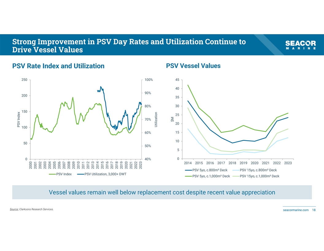 Strong Improvement in PSV Day Rates and Utilization Continue to Drive Vessel Values PSV Vessel Values PSV Rate Index and Utilization 250 100% 45 40 90% 200 35 80% 30 150 25 70% 20 100 60% 15 10 50 50% 5 0 0 40% 2014 2015 2016 2017 2018 2019 2020 2021 2022 2023 PSV 5yo, c.800m² Deck PSV 15yo, c.800m² Deck PSV Index PSV Utilization, 3,000+ DWT PSV 5yo, c.1,000m² Deck PSV 15yo, c.1,000m² Deck Vessel values remain well below replacement cost despite recent value appreciation Source: Clarksons Research Services. seacormarine.com 18 PSV Index 2000 2001 2002 2003 2004 2005 2006 2007 2008 2009 2010 2011 2012 2013 2014 2015 2016 2017 2018 2019 2020 2021 2022 2023 Utilization $M