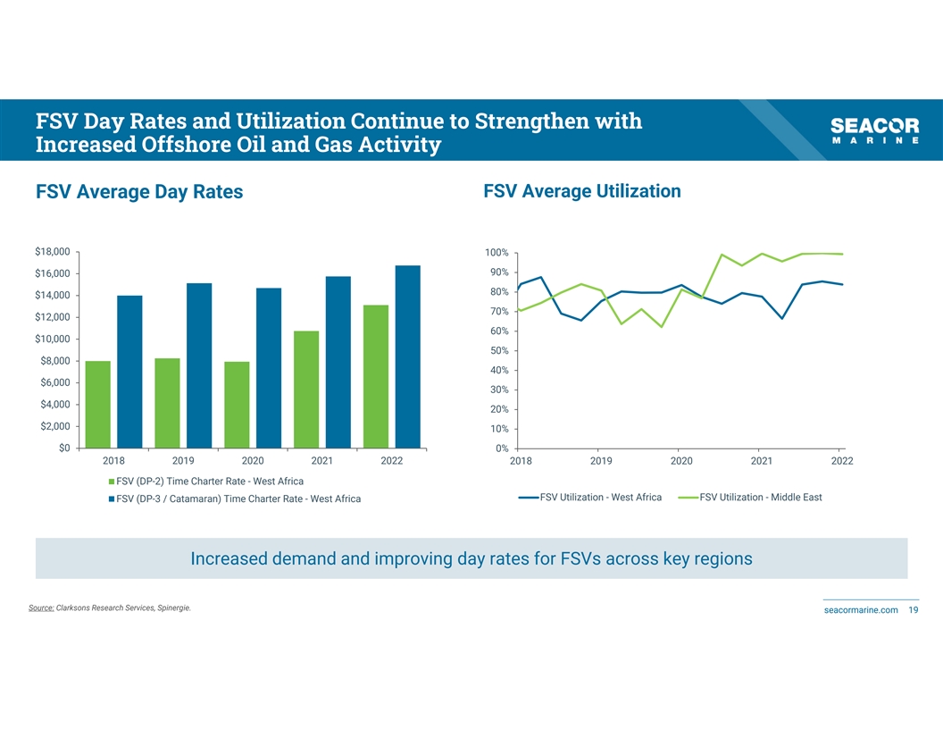 FSV Day Rates and Utilization Continue to Strengthen with Increased Offshore Oil and Gas Activity FSV Average Utilization FSV Average Day Rates $18,000 100% 90% $16,000 80% $14,000 70% $12,000 60% $10,000 50% $8,000 40% $6,000 30% $4,000 20% $2,000 10% $0 0% 2018 2019 2020 2021 2022 2018 2019 2020 2021 2022 FSV (DP-2) Time Charter Rate - West Africa FSV Utilization - West Africa FSV Utilization - Middle East FSV (DP-3 / Catamaran) Time Charter Rate - West Africa Increased demand and improving day rates for FSVs across key regions Source: Clarksons Research Services, Spinergie. seacormarine.com 19
