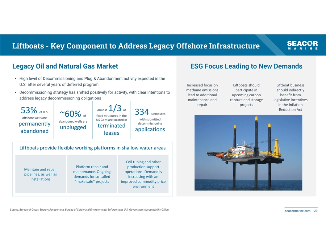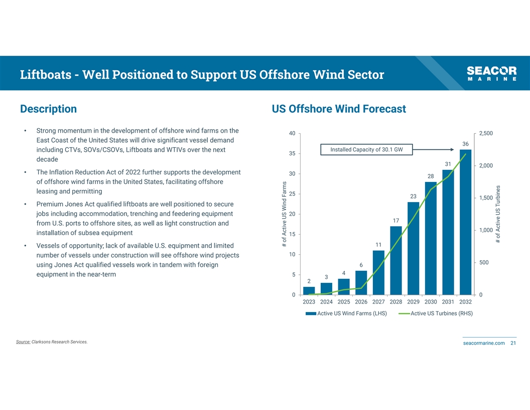 Liftboats - Key Component to Address Legacy Offshore Infrastructure Legacy Oil and Natural Gas Market ESG Focus Leading to New Demands • High level of Decommissioning and Plug & Abandonment activity expected in the U.S. after several years of deferred program Increased focus on Liftboats should Liftboat business methane emissions participate in should indirectly • Decommissioning strategy has shifted positively for activity, with clear intentions to lead to additional upcoming carbon benefit from address legacy decommissioning obligations maintenance and capture and storage legislative incentives repair projects in the Inflation Reduction Act Almost 1/3 of 53% of U.S. 334 structures ~60% of fixed structures in the offshore wells are with submitted US GoM are located in abandoned wells are decommissioning permanently terminated unplugged applications abandoned leases Liftboats provide flexible working platforms in shallow water areas Coil tubing and other Platform repair and production support Maintain and repair maintenance. Ongoing operations. Demand is pipelines, as well as demands for so-called increasing with an installations “make safe” projects improved commodity price environment Source: Bureau of Ocean Energy Management, Bureau of Safety and Environmental Enforcement, U.S. Government Accountability Office. seacormarine.com 20