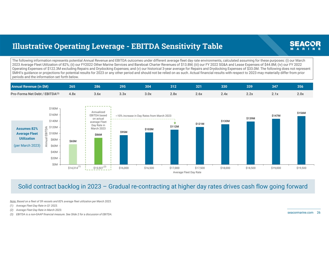 Acceleration in Day Rates and Utilization Across Asset Classes Fleet DVP Overview Recently Achieved Day Rates Preliminary Asset Class Day Rate FY 2022 Jan. 2023 Feb. 2023 Mar. 2023 2 PSV (> 800 m deck space) $28,400 PSV (21 vessels) 2 PSV (< 700 m deck space) $19,000 Day Rate $13,246 $13,568 $14,687 $15,974 FSV (Catamarans) $23,000 Utilization 76% 64% 69% 78% FSV $13,500 (1) PSV - Direct Vessel Profit $11.4M Liftboat (Premium) $75,000 FSV (25 vessels) Liftboat $28,000 AHTS $12,200 Day Rate $9,425 $10,628 $10,209 $10,936 Utilization 85% 89% 90% 94% (1) FSV - Direct Vessel Profit $20.4M Recently achieved day rates by SMHI are significantly higher than average fleet day rates for Q1 2023, implying a Liftboat (9 vessels) substantial upside from re-contracting at current market rates Day Rate $27,010 $39,002 $29,304 $35,474 Utilization 55% 30% 59% 62% (1) Liftboat - Direct Vessel Profit $4.9M Preliminary Q1 2023 Highlights AHTS (4 vessels) Day Rate $8,975 $9,028 $9,182 $9,538 Metric Utilization 69% 72% 89% 84% Total Revenue $60.0M (1) AHTS - Direct Vessel Profit $3.8M (1) Direct Vessel Profit $22.7M EBITDA $10.4M (1) Miscellaneous - Direct Vessel Profit $4.8M Average Fleet Day Rate $14,314 Average Fleet Utilization Rate 76% Average Fleet Day Rate $12,673 $13,348 $13,884 $15,507 Average Fleet Utilization 75% 70% 77% 82% (1) Total - Direct Vessel Profit 45.3M (1) Direct Vessel Profit is a non-GAAP financial measure. See Slide 2 for a discussion of Direct Vessel Profit. For reconciliation of Direct Vessel Profit to GAAP Operating Income (Loss), its most comparable GAAP measure, see the appendix to this presentation. seacormarine.com 25 Source: Company filings and Company preliminary Q1 2023 Highlights.