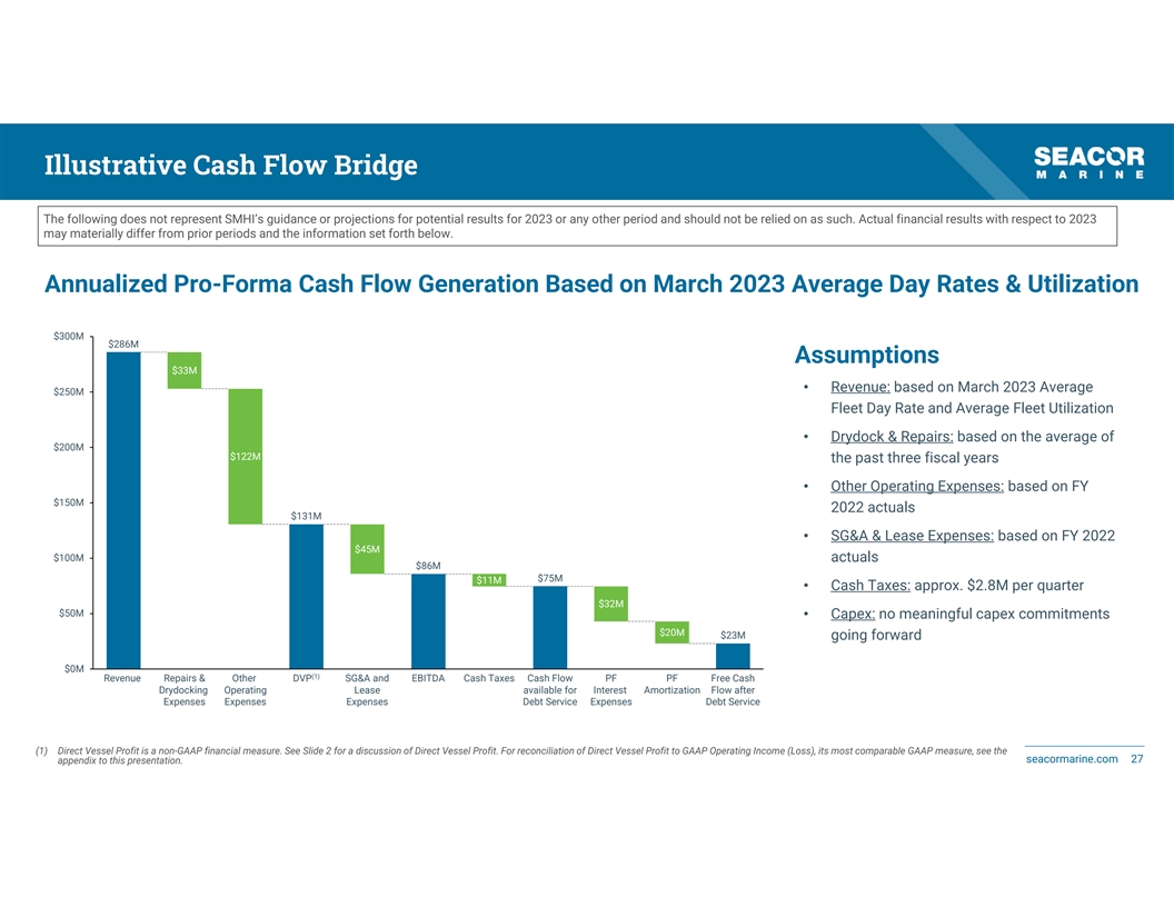 Illustrative Operating Leverage - EBITDA Sensitivity Table The following information represents potential Annual Revenue and EBITDA outcomes under different average fleet day rate environments, calculated assuming for these purposes: (i) our March 2023 Average Fleet Utilization of 82%; (ii) our FY2022 Other Marine Services and Bareboat Charter Revenues of $13.8M; (iii) our FY 2022 SG&A and Lease Expenses of $44.8M; (iv) our FY 2022 Operating Expenses of $122.3M excluding Repairs and Drydocking Expenses; and (v) our historical 3-year average for Repairs and Drydocking Expenses of $33.0M. The following does not represent SMHI’s guidance or projections for potential results for 2023 or any other period and should not be relied on as such. Actual financial results with respect to 2023 may materially differ from prior periods and the information set forth below. Annual Revenue (in $M) 265 286 295 304 312 321 330 339 347 356 (3) Pro-Forma Net Debt / EBITDA 4.8x 3.6x 3.3x 3.0x 2.8x 2.6x 2.4x 2.2x 2.1x 2.0x $180M Annualized $156M $160M EBITDA based ~10% increase in Day Rates from March 2023 $147M on actual $139M $140M $130M average Fleet $121M Day Rate in $112M $120M March 2023 Assumes 82% $103M $95M $100M Average Fleet $86M Utilization $80M $65M (per March 2023) $60M $40M $20M $0M (1) (2) $14,314 $15,507 $16,000 $16,500 $17,000 $17,500 $18,000 $18,500 $19,000 $19,500 Average Fleet Day Rate Solid contract backlog in 2023 – Gradual re-contracting at higher day rates drives cash flow going forward Note: Based on a fleet of 59 vessels and 82% average fleet utilization per March 2023. (1) Average Fleet Day Rate in Q1 2023. (2) Average Fleet Day Rate in March 2023. seacormarine.com 26 (3) EBITDA is a non-GAAP financial measure. See Slide 2 for a discussion of EBITDA. Annual EBITDA