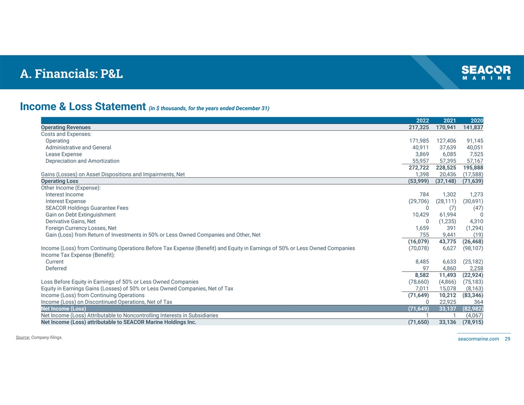 A. Financials: P&L Income & Loss Statement (in $ thousands, for the years ended December 31) 2022 2021 2020 Operating Revenues 217,325 170,941 141,837 Costs and Expenses: Operating 171,985 127,406 91,145 Administrative and General 40,911 37,639 40,051 Lease Expense 3,869 6,085 7,525 Depreciation and Amortization 55,957 57,395 57,167 272,722 228,525 195,888 Gains (Losses) on Asset Dispositions and Impairments, Net 1,398 20,436 (17,588) Operating Loss (53,999) (37,148) (71,639) Other Income (Expense): Interest Income 784 1,302 1,273 Interest Expense (29,706) (28,111) (30,691) SEACOR Holdings Guarantee Fees 0 (7) (47) Gain on Debt Extinguishment 10,429 61,994 0 Derivative Gains, Net 0 (1,235) 4,310 Foreign Currency Losses, Net 1,659 391 (1,294) Gain (Loss) from Return of Investments in 50% or Less Owned Companies and Other, Net 755 9,441 (19) (16,079) 43,775 (26,468) Income (Loss) from Continuing Operations Before Tax Expense (Benefit) and Equity in Earnings of 50% or Less Owned Companies (70,078) 6,627 (98,107) Income Tax Expense (Benefit): Current 8,485 6,633 (25,182) Deferred 97 4,860 2,258 8,582 11,493 (22,924) Loss Before Equity in Earnings of 50% or Less Owned Companies (78,660) (4,866) (75,183) Equity in Earnings Gains (Losses) of 50% or Less Owned Companies, Net of Tax 7,011 15,078 (8,163) Income (Loss) from Continuing Operations (71,649) 10,212 (83,346) Income (Loss) on Discontinued Operations, Net of Tax 0 22,925 364 Net Income (Loss) (71,649) 33,137 (82,982) Net Income (Loss) Attributable to Noncontrolling Interests in Subsidiaries 1 1 (4,067) Net Income (Loss) attributable to SEACOR Marine Holdings Inc. (71,650) 33,136 (78,915) Source: Company filings. seacormarine.com 29