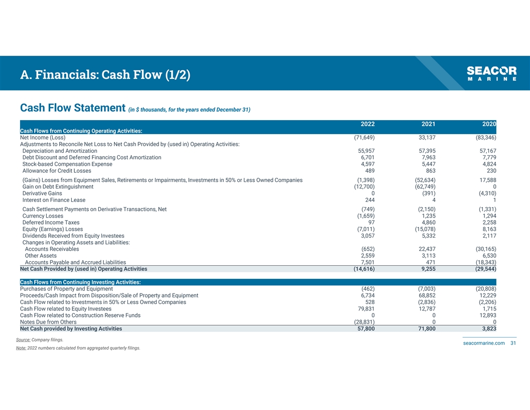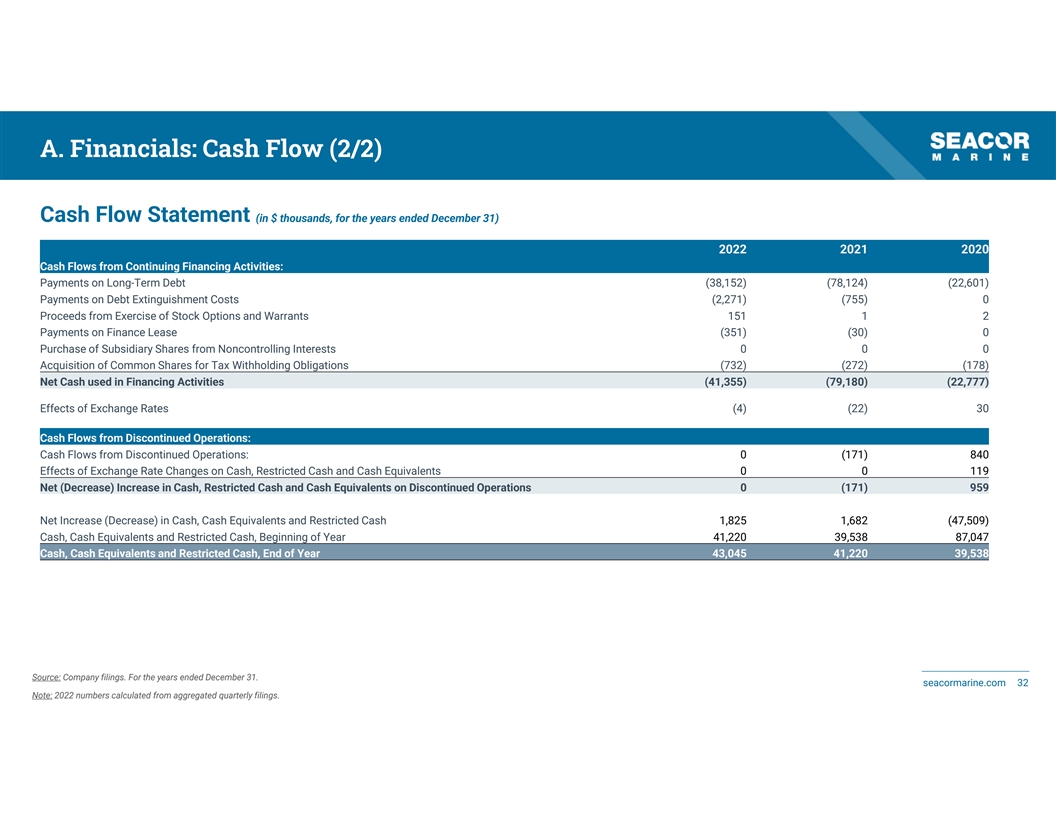 A. Financials: Cash Flow (1/2) Cash Flow Statement (in $ thousands, for the years ended December 31) 2022 2021 2020 Cash Flows from Continuing Operating Activities: Net Income (Loss) (71,649) 33,137 (83,346) Adjustments to Reconcile Net Loss to Net Cash Provided by (used in) Operating Activities: Depreciation and Amortization 55,957 57,395 57,167 Debt Discount and Deferred Financing Cost Amortization 6,701 7,963 7,779 Stock-based Compensation Expense 4,597 5,447 4,824 Allowance for Credit Losses 489 863 230 (Gains) Losses from Equipment Sales, Retirements or Impairments, Investments in 50% or Less Owned Companies (1,398) (52,634) 17,588 Gain on Debt Extinguishment (12,700) (62,749) 0 Derivative Gains 0 (391) (4,310) Interest on Finance Lease 244 4 1 Cash Settlement Payments on Derivative Transactions, Net (749) (2,150) (1,331) Currency Losses (1,659) 1,235 1,294 Deferred Income Taxes 97 4,860 2,258 Equity (Earnings) Losses (7,011) (15,078) 8,163 Dividends Received from Equity Investees 3,057 5,332 2,117 Changes in Operating Assets and Liabilities: Accounts Receivables (652) 22,437 (30,165) Other Assets 2,559 3,113 6,530 Accounts Payable and Accrued Liabilities 7,501 471 (18,343) Net Cash Provided by (used in) Operating Activities (14,616) 9,255 (29,544) Cash Flows from Continuing Investing Activities: Purchases of Property and Equipment (462) (7,003) (20,808) Proceeds/Cash Impact from Disposition/Sale of Property and Equipment 6,734 68,852 12,229 Cash Flow related to Investments in 50% or Less Owned Companies 528 (2,836) (2,206) Cash Flow related to Equity Investees 79,831 12,787 1,715 Cash Flow related to Construction Reserve Funds 0 0 12,893 Notes Due from Others (28,831) 0 0 Net Cash provided by Investing Activities 57,800 71,800 3,823 Source: Company filings. seacormarine.com 31 Note: 2022 numbers calculated from aggregated quarterly filings.