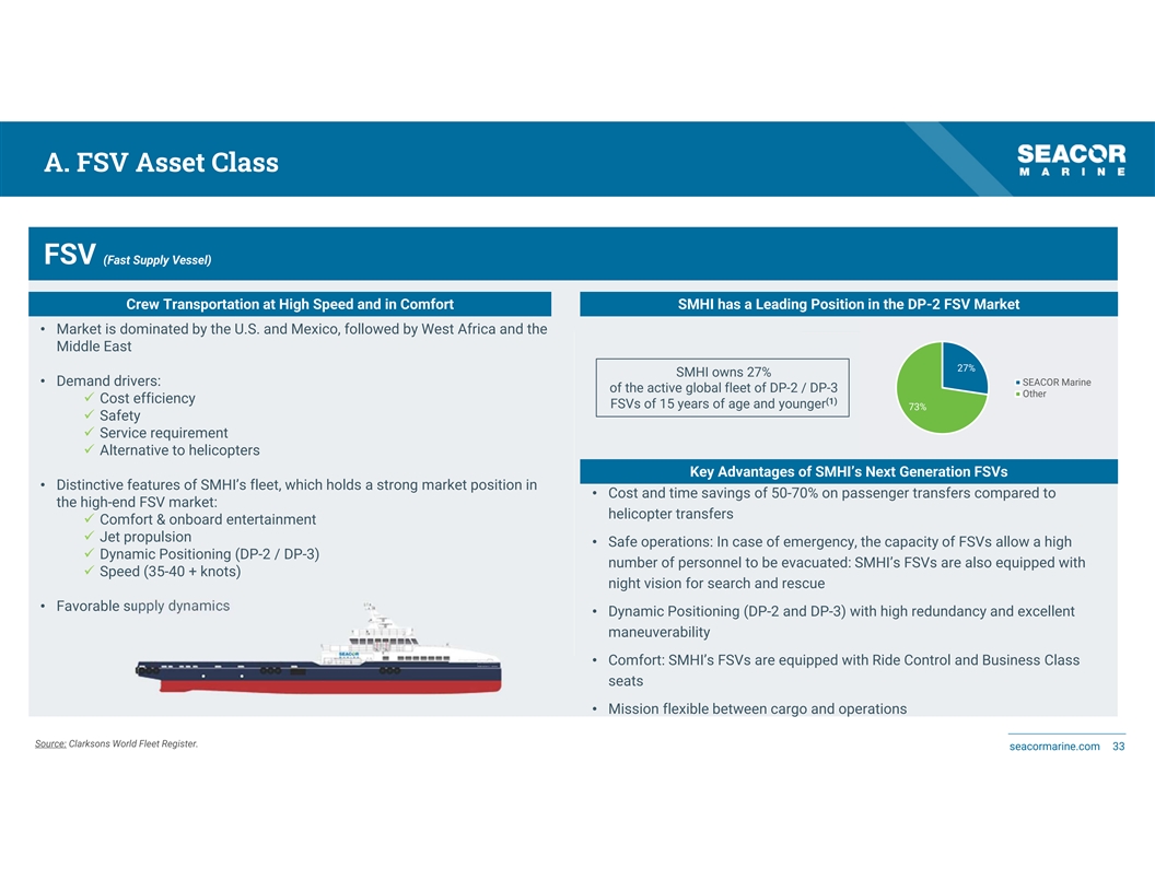 A. Financials: Cash Flow (2/2) Cash Flow Statement (in $ thousands, for the years ended December 31) 2022 2021 2020 Cash Flows from Continuing Financing Activities: Payments on Long-Term Debt (38,152) (78,124) (22,601) Payments on Debt Extinguishment Costs (2,271) (755) 0 Proceeds from Exercise of Stock Options and Warrants 151 1 2 Payments on Finance Lease (351) (30) 0 Purchase of Subsidiary Shares from Noncontrolling Interests 0 0 0 Acquisition of Common Shares for Tax Withholding Obligations (732) (272) (178) Net Cash used in Financing Activities (41,355) (79,180) (22,777) Effects of Exchange Rates (4) (22) 30 Cash Flows from Discontinued Operations: Cash Flows from Discontinued Operations: 0 (171) 840 Effects of Exchange Rate Changes on Cash, Restricted Cash and Cash Equivalents 0 0 119 Net (Decrease) Increase in Cash, Restricted Cash and Cash Equivalents on Discontinued Operations 0 (171) 959 Net Increase (Decrease) in Cash, Cash Equivalents and Restricted Cash 1,825 1,682 (47,509) Cash, Cash Equivalents and Restricted Cash, Beginning of Year 41,220 39,538 87,047 Cash, Cash Equivalents and Restricted Cash, End of Year 43,045 41,220 39,538 Source: Company filings. For the years ended December 31. seacormarine.com 32 Note: 2022 numbers calculated from aggregated quarterly filings.