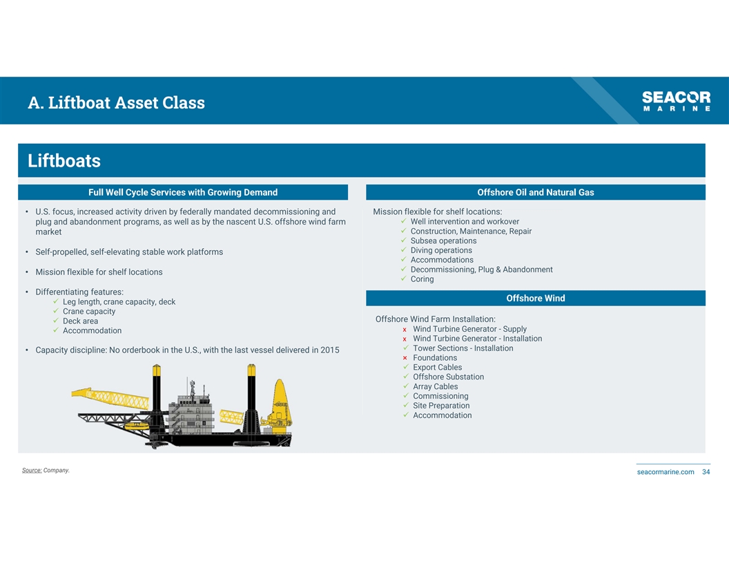 A. Liftboat Asset Class Liftboats Full Well Cycle Services with Growing Demand Offshore Oil and Natural Gas • U.S. focus, increased activity driven by federally mandated decommissioning and Mission flexible for shelf locations: plug and abandonment programs, as well as by the nascent U.S. offshore wind farm ü Well intervention and workover ü Construction, Maintenance, Repair market ü Subsea operations ü Diving operations • Self-propelled, self-elevating stable work platforms ü Accommodations ü Decommissioning, Plug & Abandonment • Mission flexible for shelf locations ü Coring • Differentiating features: Offshore Wind ü Leg length, crane capacity, deck ü Crane capacity Offshore Wind Farm Installation: ü Deck area x Wind Turbine Generator - Supply ü Accommodation x Wind Turbine Generator - Installation ü Tower Sections - Installation • Capacity discipline: No orderbook in the U.S., with the last vessel delivered in 2015 × Foundations ü Export Cables ü Offshore Substation ü Array Cables ü Commissioning ü Site Preparation ü Accommodation Source: Company. seacormarine.com 34