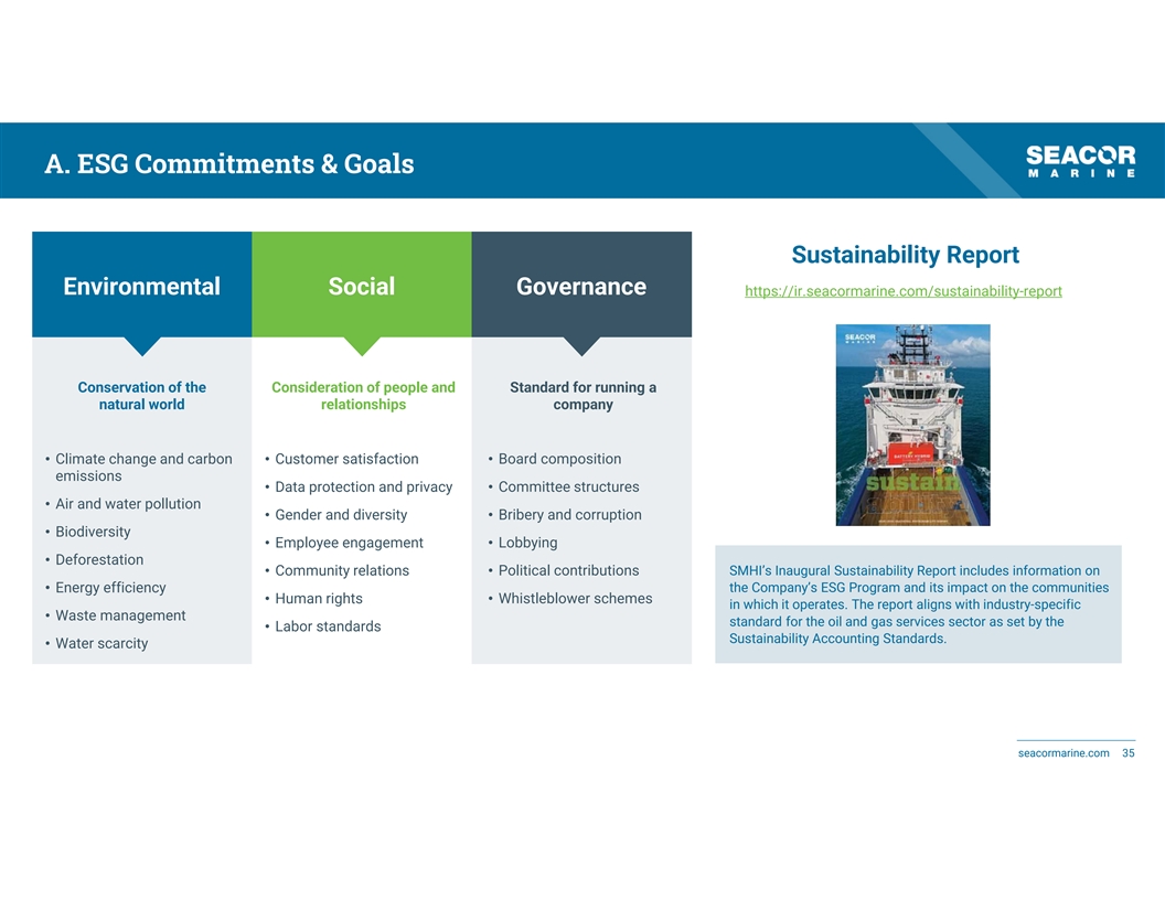 A. ESG Commitments & Goals Sustainability Report Environmental Social Governance https://ir.seacormarine.com/sustainability-report Conservation of the Consideration of people and Standard for running a natural world relationships company • Climate change and carbon • Customer satisfaction • Board composition emissions • Data protection and privacy • Committee structures • Air and water pollution • Gender and diversity • Bribery and corruption • Biodiversity • Employee engagement • Lobbying • Deforestation • Political contributions SMHI’s Inaugural Sustainability Report includes information on • Community relations • Energy efficiency the Company’s ESG Program and its impact on the communities • Whistleblower schemes • Human rights in which it operates. The report aligns with industry-specific • Waste management standard for the oil and gas services sector as set by the • Labor standards Sustainability Accounting Standards. • Water scarcity seacormarine.com 35