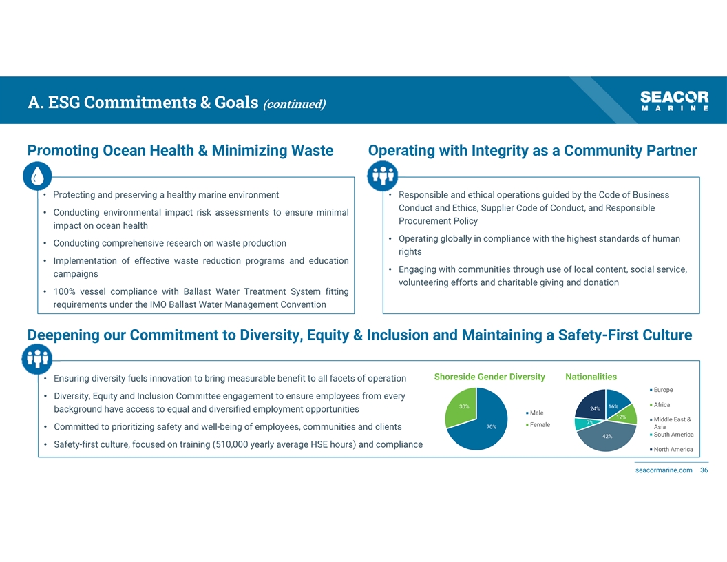 A. ESG Commitments & Goals (continued) Promoting Ocean Health & Minimizing Waste Operating with Integrity as a Community Partner • Protecting and preserving a healthy marine environment • Responsible and ethical operations guided by the Code of Business Conduct and Ethics, Supplier Code of Conduct, and Responsible • Conducting environmental impact risk assessments to ensure minimal Procurement Policy impact on ocean health • Operating globally in compliance with the highest standards of human • Conducting comprehensive research on waste production rights • Implementation of effective waste reduction programs and education • Engaging with communities through use of local content, social service, campaigns volunteering efforts and charitable giving and donation • 100% vessel compliance with Ballast Water Treatment System fitting requirements under the IMO Ballast Water Management Convention Deepening our Commitment to Diversity, Equity & Inclusion and Maintaining a Safety-First Culture Shoreside Gender Diversity Nationalities • Ensuring diversity fuels innovation to bring measurable benefit to all facets of operation Europe • Diversity, Equity and Inclusion Committee engagement to ensure employees from every Africa 30% 16% 24% background have access to equal and diversified employment opportunities Male 12% Middle East & 7% Female 70% Asia • Committed to prioritizing safety and well-being of employees, communities and clients South America 42% • Safety-first culture, focused on training (510,000 yearly average HSE hours) and compliance North America seacormarine.com 36