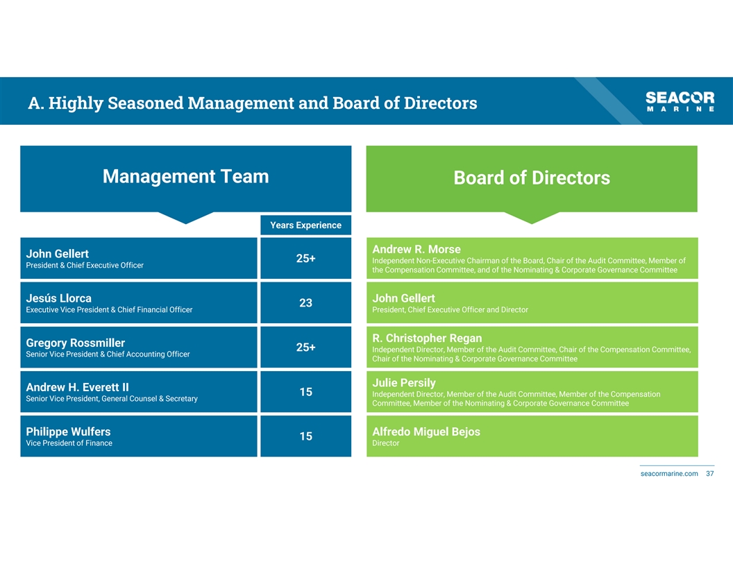 A. Highly Seasoned Management and Board of Directors Management Team Board of Directors Years Experience Andrew R. Morse John Gellert 25+ Independent Non-Executive Chairman of the Board, Chair of the Audit Committee, Member of President & Chief Executive Officer the Compensation Committee, and of the Nominating & Corporate Governance Committee Jesús Llorca John Gellert 23 Executive Vice President & Chief Financial Officer President, Chief Executive Officer and Director R. Christopher Regan Gregory Rossmiller 25+ Independent Director, Member of the Audit Committee, Chair of the Compensation Committee, Senior Vice President & Chief Accounting Officer Chair of the Nominating & Corporate Governance Committee Julie Persily Andrew H. Everett II 15 Independent Director, Member of the Audit Committee, Member of the Compensation Senior Vice President, General Counsel & Secretary Committee, Member of the Nominating & Corporate Governance Committee Philippe Wulfers Alfredo Miguel Bejos 15 Vice President of Finance Director seacormarine.com 37