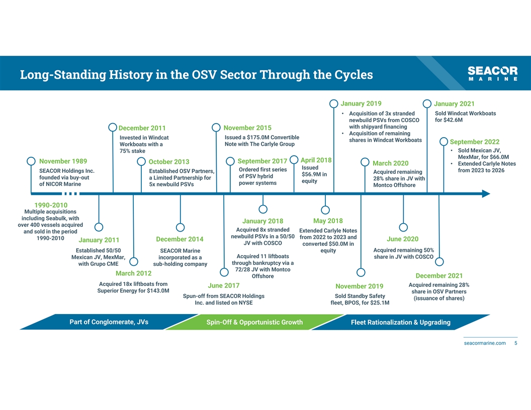 Long-Standing History in the OSV Sector Through the Cycles January 2019 January 2021 • Acquisition of 3x stranded Sold Windcat Workboats newbuild PSVs from COSCO for $42.6M with shipyard financing November 2015 December 2011 • Acquisition of remaining Issued a $175.0M Convertible Invested in Windcat shares in Windcat Workboats September 2022 Workboats with a Note with The Carlyle Group 75% stake • Sold Mexican JV, MexMar, for $66.0M April 2018 November 1989 September 2017 October 2013 March 2020 • Extended Carlyle Notes Issued Ordered first series from 2023 to 2026 SEACOR Holdings Inc. Established OSV Partners, Acquired remaining $56.9M in of PSV hybrid founded via buy-out a Limited Partnership for 28% share in JV with equity power systems of NICOR Marine 5x newbuild PSVs Montco Offshore 1990-2010 Multiple acquisitions including Seabulk, with May 2018 January 2018 over 400 vessels acquired Acquired 8x stranded Extended Carlyle Notes and sold in the period newbuild PSVs in a 50/50 from 2022 to 2023 and 1990-2010 June 2020 December 2014 January 2011 JV with COSCO converted $50.0M in Acquired remaining 50% Established 50/50 SEACOR Marine equity Acquired 11 liftboats share in JV with COSCO Mexican JV, MexMar, incorporated as a through bankruptcy via a with Grupo CME sub-holding company 72/28 JV with Montco March 2012 Offshore December 2021 Acquired 18x liftboats from Acquired remaining 28% June 2017 November 2019 Superior Energy for $143.0M share in OSV Partners Spun-off from SEACOR Holdings Sold Standby Safety (issuance of shares) Inc. and listed on NYSE fleet, BPOS, for $25.1M Part of Conglomerate, JVs Spin-Off & Opportunistic Growth Fleet Rationalization & Upgrading seacormarine.com 5