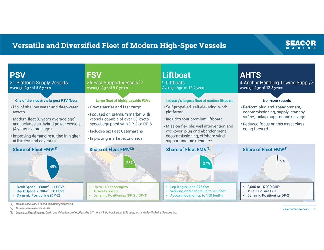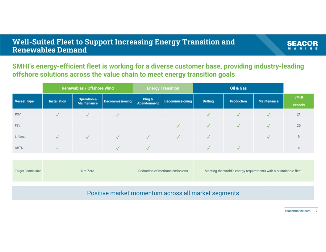 Versatile and Diversified Fleet of Modern High-Spec Vessels PSV FSV Liftboat AHTS (1) (2) 21 Platform Supply Vessels 25 Fast Support Vessels 9 Liftboats 4 Anchor Handling Towing Supply Average Age of 5.5 years Average Age of 9.0 years Average Age of 12.2 years Average Age of 13.8 years One of the industry’s largest PSV fleets Large fleet of highly capable FSVs Industry’s largest fleet of modern liftboats Non-core vessels • Self-propelled, self-elevating, work • Mix of shallow water and deepwater • Crew transfer and fast cargo • Perform plug and abandonment, platforms assets decommissioning, supply, standby • Focused on premium market with safety, jackup support and salvage • Modern fleet (6 years average age) vessels capable of over 30 knots • Includes four premium liftboats and includes six hybrid power vessels speed, equipped with DP-2 or DP-3 • Reduced focus on this asset class • Mission flexible: well intervention and (4 years average age) going forward • Includes six Fast Catamarans workover, plug and abandonment, decommissioning, offshore wind • Improving demand resulting in higher • Improving market economics utilization and day rates support and maintenance (3) (3) (3) (3) Share of Fleet FMV Share of Fleet FMV Share of Fleet FMV Share of Fleet FMV 2% 26% 27% 45% 2 • Deck Space > 800m : 11 PSVs • Up to 150 passengers • Leg length up to 295 feet • 8,000 to 15,000 BHP 2 • Deck Space < 700m : 10 PSVs • 40 knots speed • Working water depth up to 230 feet • 120t + Bollard Pull • Accommodation up to 150 berths • Dynamic Positioning (DP-2) • Dynamic Positioning (DP-2) • Dynamic Positioning (DP-2 / DP-3) (1) Includes one leased-in and two managed vessels. (2) Includes one leased-in vessel. seacormarine.com 6 (3) Source of Vessel Values: Clarksons Valuation Limited, Fearnley Offshore AS, Dufour, Laskay & Strouse, Inc. and Merrill Marine Services Inc.