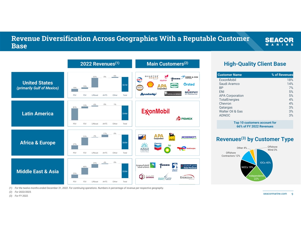 Global Presence to Meet Customer Needs Total Fleet: 59 Vessels Offices Middle East & Asia 16 5 PSVs United States 15 8 FSVs 2 Liftboats 3 PSVs 1 AHTS 5 FSVs (1 leased-in, 2 managed) 7 Liftboats Houston, TX Al Khobar, KSA Morgan City, LA Dubai, UAE Georgetown, Guyana Singapore Cabinda, Angola Luanda, Angola Latin America 9 Africa & Europe 19 7 PSVs 6 PSVs 2 FSVs 10 FSVs 3 AHTSs (1 leased-in) Note: As of April 20, 2023. seacormarine.com 8