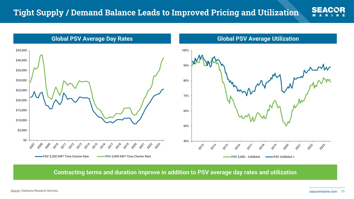 Supply Side Constraints Remain Aging Stacked Fleet Limited Supply 1,400 70% 250 12% 571 stacked OSVs per FYE 2023 Total OSV Fleet of 3,431 vessels per FYE 2023 10% 1,200 60% 200 8% 1,000 50% 150 6% 800 40% 100 4% 600 30% 50 2% 400 20% 0 0% 200 10% -50 -2% 0 0% -100 -4% 2007 2008 2009 2010 2011 2012 2013 2014 2015 2016 2017 2018 2019 2020 2021 2022 2023 2012 2013 2014 2015 2016 2017 2018 2019 2020 2021 2022 2023 2024 AHTS Attrition & Conversion PSV Attrition & Conversion Stacked < 1 Year Stacked 1-2 Years AHTS Deliveries PSV Deliveries Stacked 2-3 Years Stacked > 3 Years % of Fleet Stacked > 3 Years (rhs) % of OSV Fleet Stacked (rhs) Fleet Growth (rhs) Limited orderbook, constrained financing and continued development of local cabotage leads to a favorable supply and demand balance Source: Clarksons Research Services. seacormarine.com 10 Number of Vessels Number of Vessels