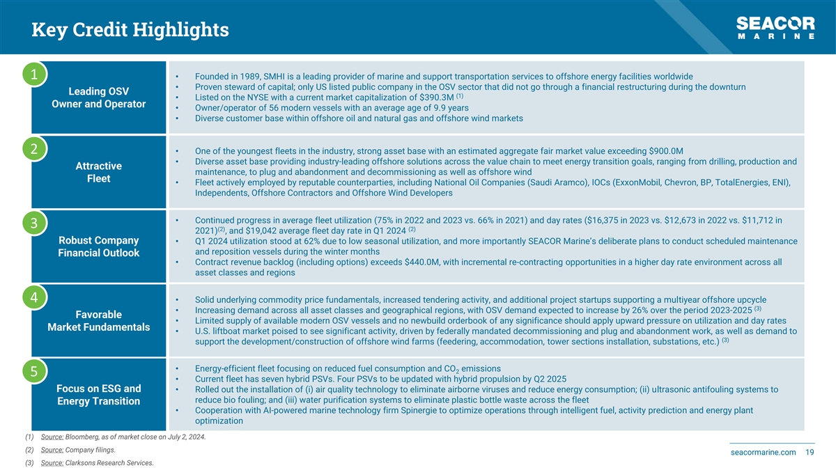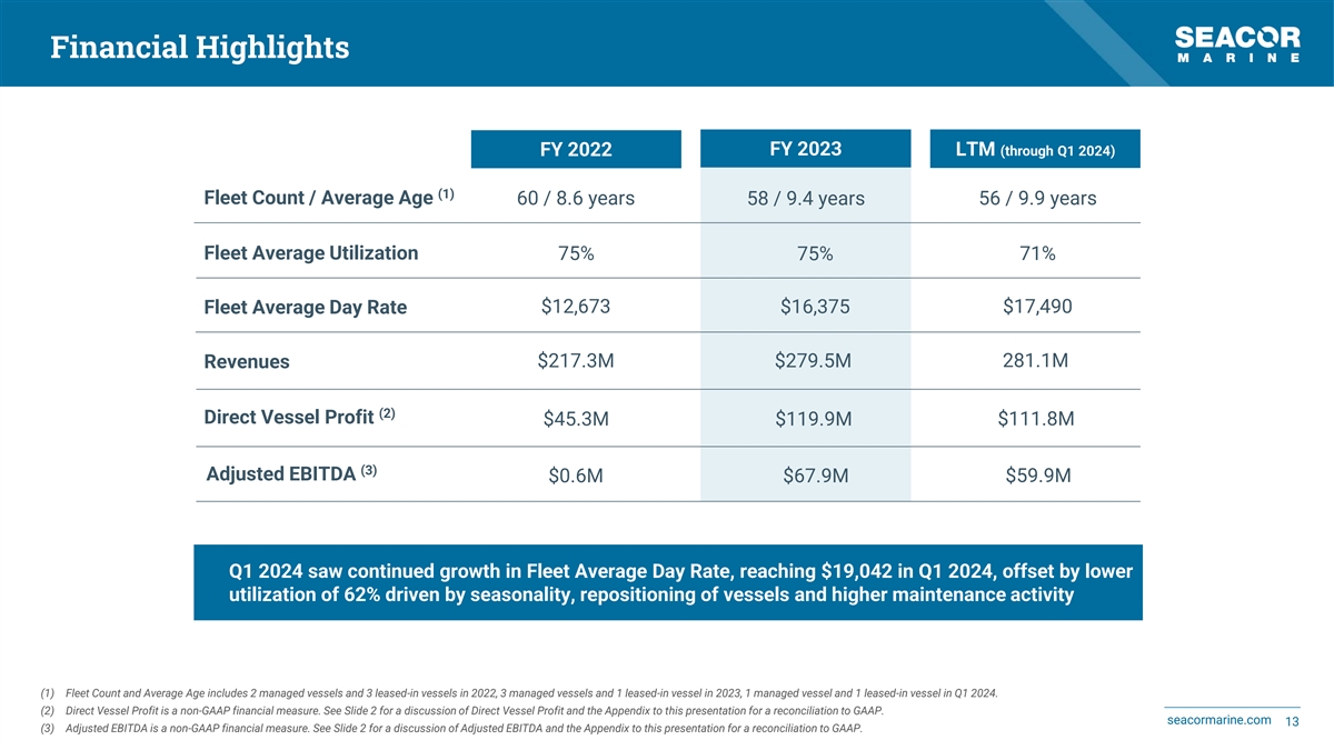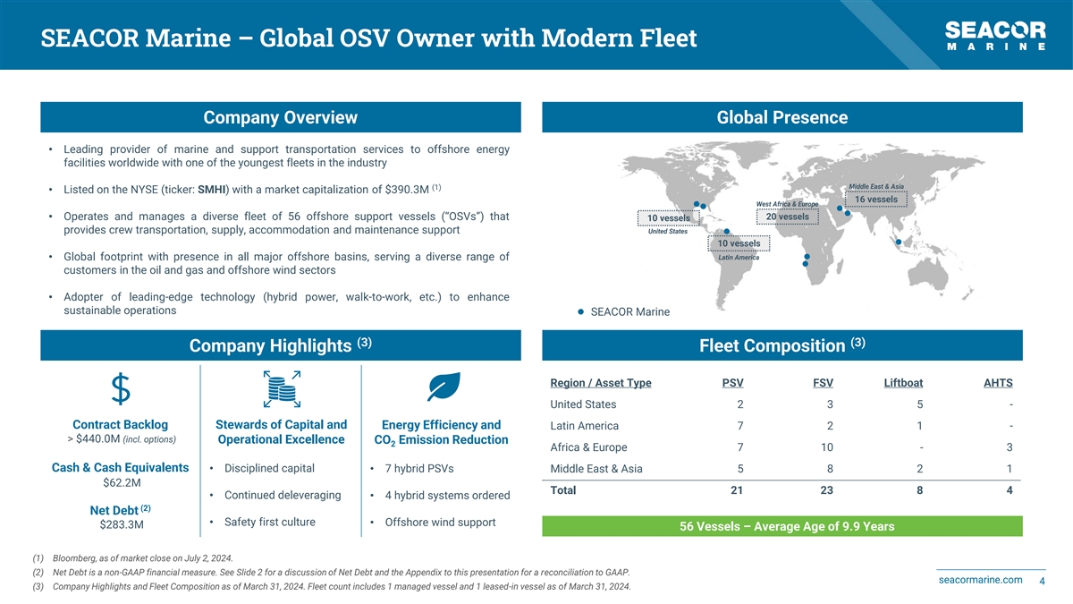 Forward-Looking Statements Forward-Looking Statements discussed in this release as well as in other reports, materials and oral statements that SEACOR Marine Holdings Inc. (“SEACOR Marine” or the “Company”) releases from time to time to the public constitute “forward-looking statements” within the meaning of the Private Securities Litigation Reform Act of 1995. Generally, words such as “anticipate,” “estimate,” “expect,” “project,” “intend,” “believe,” “plan,” “target,” “forecast” and similar expressions are intended to identify forward-looking statements and includes the information on Slide 26. Such forward- looking statements concern management's expectations, strategic objectives, business prospects, anticipated economic performance and financial condition and other similar matters. Forward- looking statements are inherently uncertain and subject to a variety of assumptions, risks and uncertainties such as the completion of our financial close process for the quarter, that could cause actual results to differ materially from those anticipated or expected by the management of the Company. These statements are not guarantees of future performance and actual events or results may differ significantly from these statements. Actual events or results are subject to significant known and unknown risks, uncertainties and other important factors, many of which are beyond the Company's control. It should be understood that it is not possible to predict or identify all such factors. Investors and analysts should not place undue reliance on forward-looking statements. Forward-looking statements speak only as of the date of the document in which they are made. The Company disclaims any obligation or undertaking to provide any updates or revisions to any forward-looking statement to reflect any change in the Company's expectations or any change in events, conditions or circumstances on which the forward-looking statement is based, except as required by law. It is advisable, however, to consult any further disclosures the Company makes on related subjects in its filings with the U.S. Securities and Exchange Commission, including Annual Reports on Form 10-K, Quarterly Reports on Form 10-Q and Current Reports on Form 8-K (if any). These statements constitute the Company's cautionary statements under the Private Securities Litigation Reform Act of 1995. Non-GAAP Financial Measures This presentation includes certain non-GAAP financial measures. Direct Vessel Profit (defined as operating revenues less operating costs and expenses including major repairs and drydocking expenses, “DVP”), when applied to individual vessels, fleet categories or the combined fleet. DVP is a critical financial measure used by the Company to analyze and compare the operating performance of its individual vessels, fleet categories, regions and combined fleet, without regard to financing decisions (depreciation for owned vessels vs. leased-in expense for leased-in vessels). DVP is also useful when comparing the Company’s fleet performance against those of our competitors who may have differing fleet financing structures. DVP has material limitations as an analytical tool in that it does not reflect all of the costs associated with the ownership and operation of our fleet, and it should not be considered in isolation or used as a substitute for our results as reported under GAAP. Adjusted EBITDA is defined as DVP less general and administrative expenses and lease expenses. We believe that the presentation of Adjusted EBITDA provides useful information to investors and management uses it to assess our on-going operations. Our use of Adjusted EBITDA should not be viewed as an alternative to measures calculated in accordance with GAAP. Adjusted EBITDA has limitations as analytical tool such as: (i) Adjusted EBITDA does not reflect the impact of earnings or charges that we consider not to be indicative of our on-going operations, (ii) Adjusted EBITDA does not reflect interest and income tax expense; and (iii) other companies, including other companies in our industry, may calculate Adjusted EBITDA differently than we do. Net Debt is defined as total debt (the most comparable GAAP measure, calculated as long-term debt plus current portion of long-term debt excluding discount and issuance costs) less cash and cash equivalents (including restricted cash). We believe that the presentation of Net Debt provides useful information to investors and management uses it to compare total debt less cash and cash equivalents across periods on a consistent basis. Reconciliation for each of these non-GAAP measures are included as an appendix to this presentation. seacormarine.com 2