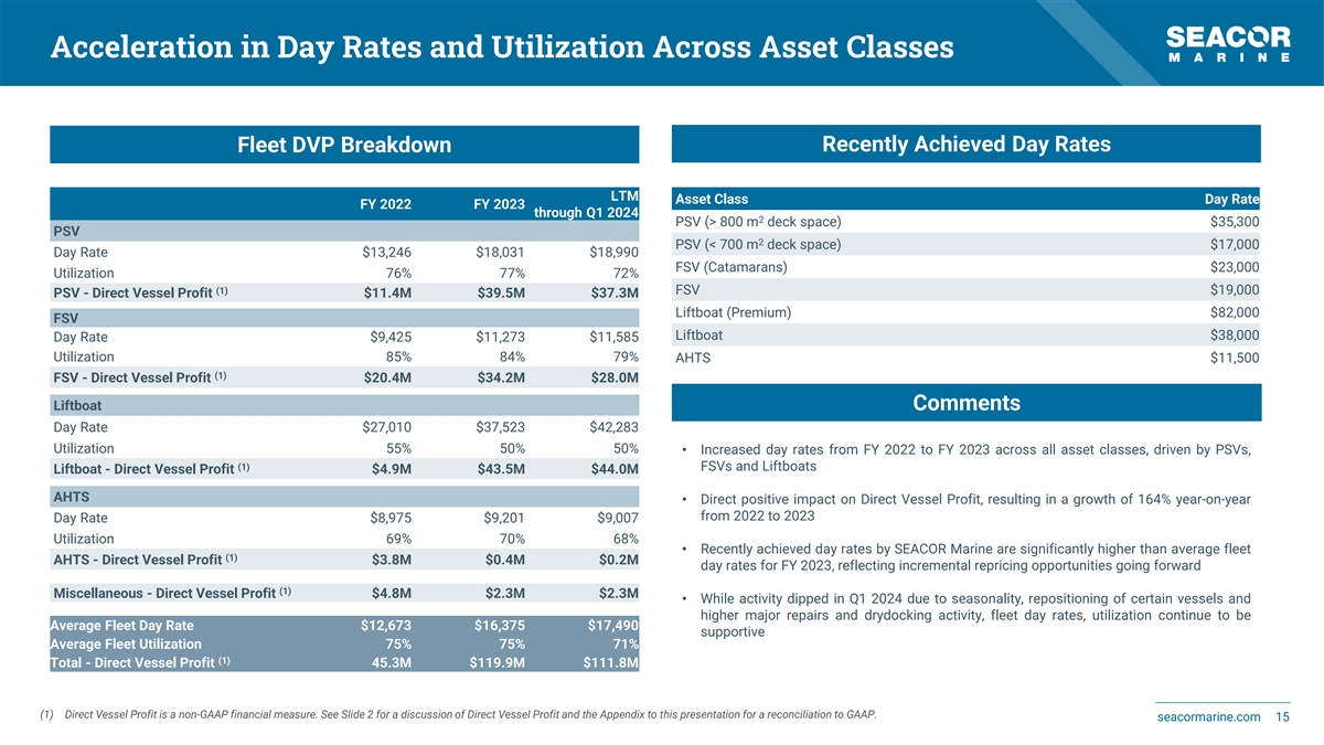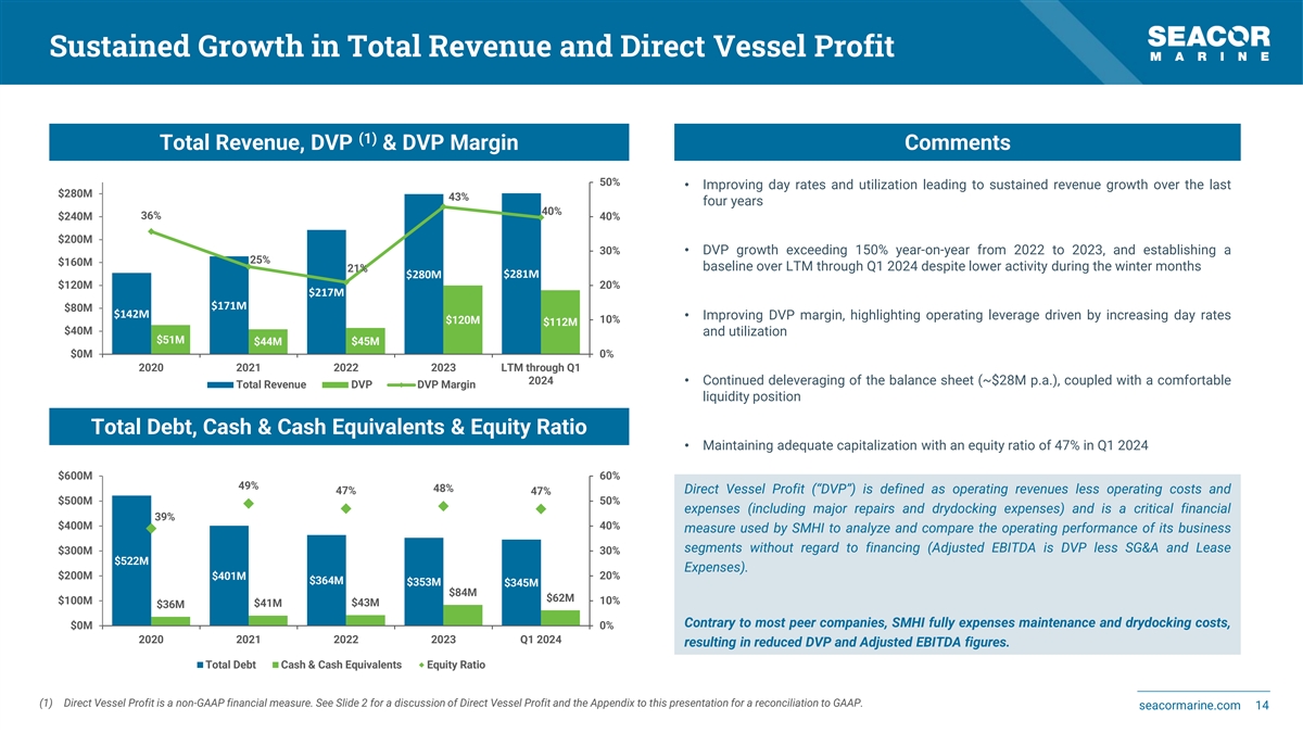 Financial Highlights FY 2023 LTM (through Q1 2024) FY 2022 (1) Fleet Count / Average Age 60 / 8.6 years 58 / 9.4 years 56 / 9.9 years Fleet Average Utilization 75% 71% 75% $12,673 $17,490 Fleet Average Day Rate $16,375 281.1M Revenues $217.3M $279.5M (2) Direct Vessel Profit $111.8M $45.3M $119.9M (3) Adjusted EBITDA $0.6M $67.9M $59.9M Q1 2024 saw continued growth in Fleet Average Day Rate, reaching $19,042 in Q1 2024, offset by lower utilization of 62% driven by seasonality, repositioning of vessels and higher maintenance activity (1) Fleet Count and Average Age includes 2 managed vessels and 3 leased-in vessels in 2022, 3 managed vessels and 1 leased-in vessel in 2023, 1 managed vessel and 1 leased-in vessel in Q1 2024. (2) Direct Vessel Profit is a non-GAAP financial measure. See Slide 2 for a discussion of Direct Vessel Profit and the Appendix to this presentation for a reconciliation to GAAP. seacormarine.com 13 (3) Adjusted EBITDA is a non-GAAP financial measure. See Slide 2 for a discussion of Adjusted EBITDA and the Appendix to this presentation for a reconciliation to GAAP.