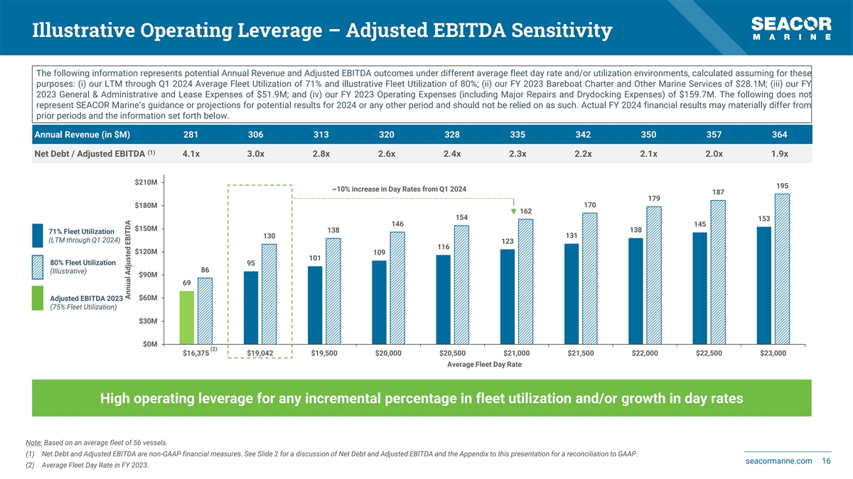 Acceleration in Day Rates and Utilization Across Asset Classes Recently Achieved Day Rates Fleet DVP Breakdown LTM Asset Class Day Rate FY 2022 FY 2023 through Q1 2024 2 PSV (> 800 m deck space) $35,300 PSV 2 PSV (< 700 m deck space) $17,000 Day Rate $13,246 $18,031 $18,990 FSV (Catamarans) $23,000 Utilization 76% 77% 72% (1) FSV $19,000 PSV - Direct Vessel Profit $11.4M $39.5M $37.3M Liftboat (Premium) $82,000 FSV Liftboat $38,000 Day Rate $9,425 $11,273 $11,585 Utilization 85% 84% 79% AHTS $11,500 (1) FSV - Direct Vessel Profit $20.4M $34.2M $28.0M Liftboat Comments Day Rate $27,010 $37,523 $42,283 Utilization 55% 50% 50%• Increased day rates from FY 2022 to FY 2023 across all asset classes, driven by PSVs, (1) FSVs and Liftboats Liftboat - Direct Vessel Profit $4.9M $43.5M $44.0M AHTS • Direct positive impact on Direct Vessel Profit, resulting in a growth of 164% year-on-year from 2022 to 2023 Day Rate $8,975 $9,201 $9,007 Utilization 69% 70% 68% • Recently achieved day rates by SEACOR Marine are significantly higher than average fleet (1) AHTS - Direct Vessel Profit $3.8M $0.4M $0.2M day rates for FY 2023, reflecting incremental repricing opportunities going forward (1) Miscellaneous - Direct Vessel Profit $4.8M $2.3M $2.3M • While activity dipped in Q1 2024 due to seasonality, repositioning of certain vessels and higher major repairs and drydocking activity, fleet day rates, utilization continue to be Average Fleet Day Rate $12,673 $16,375 $17,490 supportive Average Fleet Utilization 75% 75% 71% (1) Total - Direct Vessel Profit 45.3M $119.9M $111.8M (1) Direct Vessel Profit is a non-GAAP financial measure. See Slide 2 for a discussion of Direct Vessel Profit and the Appendix to this presentation for a reconciliation to GAAP. seacormarine.com 15
