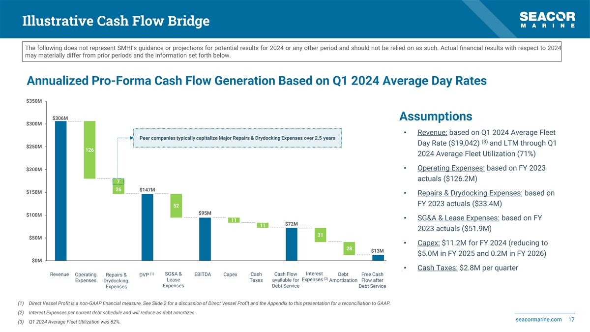 Illustrative Operating Leverage – Adjusted EBITDA Sensitivity The following information represents potential Annual Revenue and Adjusted EBITDA outcomes under different average fleet day rate and/or utilization environments, calculated assuming for these purposes: (i) our LTM through Q1 2024 Average Fleet Utilization of 71% and illustrative Fleet Utilization of 80%; (ii) our FY 2023 Bareboat Charter and Other Marine Services of $28.1M; (iii) our FY 2023 General & Administrative and Lease Expenses of $51.9M; and (iv) our FY 2023 Operating Expenses (including Major Repairs and Drydocking Expenses) of $159.7M. The following does not represent SEACOR Marine’s guidance or projections for potential results for 2024 or any other period and should not be relied on as such. Actual FY 2024 financial results may materially differ from prior periods and the information set forth below. Annual Revenue (in $M) 281 306 313 320 328 335 342 350 357 364 (1) Net Debt / Adjusted EBITDA 4.1x 3.0x 2.8x 2.6x 2.4x 2.3x 2.2x 2.1x 2.0x 1.9x $210M 195 ~10% increase in Day Rates from Q1 2024 187 179 $180M 170 162 154 153 146 145 $150M 138 138 71% Fleet Utilization 131 130 (LTM through Q1 2024) 123 116 $120M 109 101 80% Fleet Utilization 95 86 (Illustrative) $90M 69 Adjusted EBITDA 2023 $60M (75% Fleet Utilization) $30M $0M (2) $16,375 $19,042 $19,500 $20,000 $20,500 $21,000 $21,500 $22,000 $22,500 $23,000 Average Fleet Day Rate High operating leverage for any incremental percentage in fleet utilization and/or growth in day rates Note: Based on an average fleet of 56 vessels. (1) Net Debt and Adjusted EBITDA are non-GAAP financial measures. See Slide 2 for a discussion of Net Debt and Adjusted EBITDA and the Appendix to this presentation for a reconciliation to GAAP. seacormarine.com 16 (2) Average Fleet Day Rate in FY 2023. Annual Adjusted EBITDA