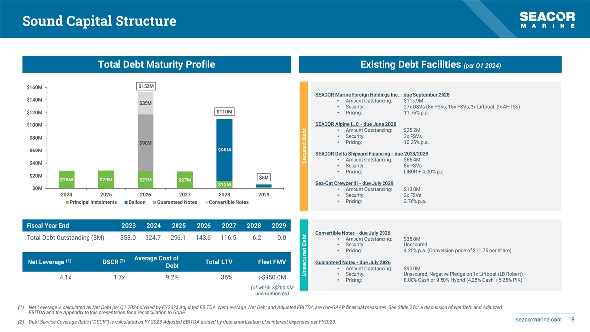 Illustrative Cash Flow Bridge The following does not represent SMHI’s guidance or projections for potential results for 2024 or any other period and should not be relied on as such. Actual financial results with respect to 2024 may materially differ from prior periods and the information set forth below. Annualized Pro-Forma Cash Flow Generation Based on Q1 2024 Average Day Rates $350M $306M Assumptions $300M • Revenue: based on Q1 2024 Average Fleet Peer companies typically capitalize Major Repairs & Drydocking Expenses over 2.5 years (3) Day Rate ($19,042) and LTM through Q1 $250M 126 2024 Average Fleet Utilization (71%) $200M• Operating Expenses: based on FY 2023 actuals ($126.2M) 7 26 $147M $150M • Repairs & Drydocking Expenses: based on FY 2023 actuals ($33.4M) 52 $95M $100M • SG&A & Lease Expenses: based on FY 11 $72M $11M 11 2023 actuals ($51.9M) 31 $50M • Capex: $11.2M for FY 2024 (reducing to 28 $13M $5.0M in FY 2025 and 0.2M in FY 2026) $0M • Cash Taxes: $2.8M per quarter (1) SG&A & Interest Revenue EBITDA Capex Cash Cash Flow Debt Free Cash Operating Repairs & DVP (2) Lease available for Expenses Expenses Drydocking Taxes Amortization Flow after Expenses Debt Service Debt Service Expenses (1) Direct Vessel Profit is a non-GAAP financial measure. See Slide 2 for a discussion of Direct Vessel Profit and the Appendix to this presentation for a reconciliation to GAAP. (2) Interest Expenses per current debt schedule and will reduce as debt amortizes. seacormarine.com 17 (3) Q1 2024 Average Fleet Utilization was 62%.