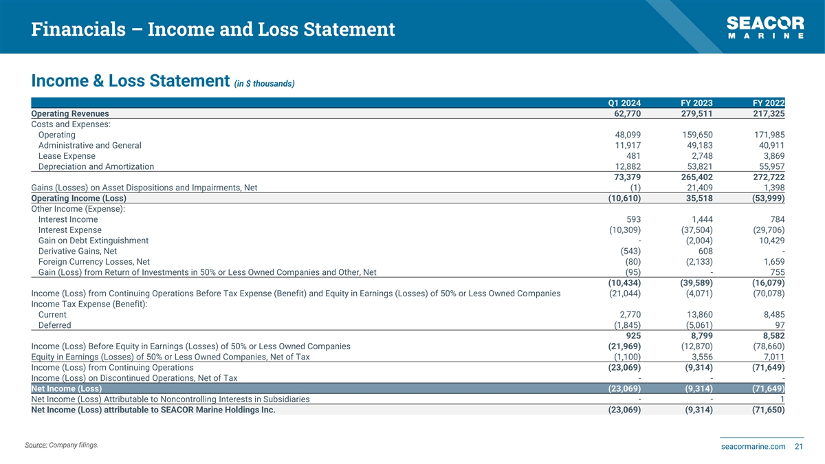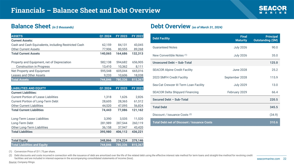 Financials – Income and Loss Statement Income & Loss Statement (in $ thousands) Q1 2024 FY 2023 FY 2022 Operating Revenues 62,770 279,511 217,325 Costs and Expenses: Operating 48,099 159,650 171,985 Administrative and General 11,917 49,183 40,911 Lease Expense 481 2,748 3,869 Depreciation and Amortization 12,882 53,821 55,957 73,379 265,402 272,722 Gains (Losses) on Asset Dispositions and Impairments, Net (1) 21,409 1,398 Operating Income (Loss) (10,610) 35,518 (53,999) Other Income (Expense): Interest Income 593 1,444 784 Interest Expense (10,309) (37,504) (29,706) Gain on Debt Extinguishment - (2,004) 10,429 Derivative Gains, Net (543) 608 - Foreign Currency Losses, Net (80) (2,133) 1,659 Gain (Loss) from Return of Investments in 50% or Less Owned Companies and Other, Net (95) - 755 (10,434) (39,589) (16,079) Income (Loss) from Continuing Operations Before Tax Expense (Benefit) and Equity in Earnings (Losses) of 50% or Less Owned Companies (21,044) (4,071) (70,078) Income Tax Expense (Benefit): Current 2,770 13,860 8,485 Deferred (1,845) (5,061) 97 925 8,799 8,582 Income (Loss) Before Equity in Earnings (Losses) of 50% or Less Owned Companies (21,969) (12,870) (78,660) Equity in Earnings (Losses) of 50% or Less Owned Companies, Net of Tax (1,100) 3,556 7,011 Income (Loss) from Continuing Operations (23,069) (9,314) (71,649) Income (Loss) on Discontinued Operations, Net of Tax - - - Net Income (Loss) (23,069) (9,314) (71,649) Net Income (Loss) Attributable to Noncontrolling Interests in Subsidiaries - - 1 Net Income (Loss) attributable to SEACOR Marine Holdings Inc. (23,069) (9,314) (71,650) Source: Company filings. seacormarine.com 21