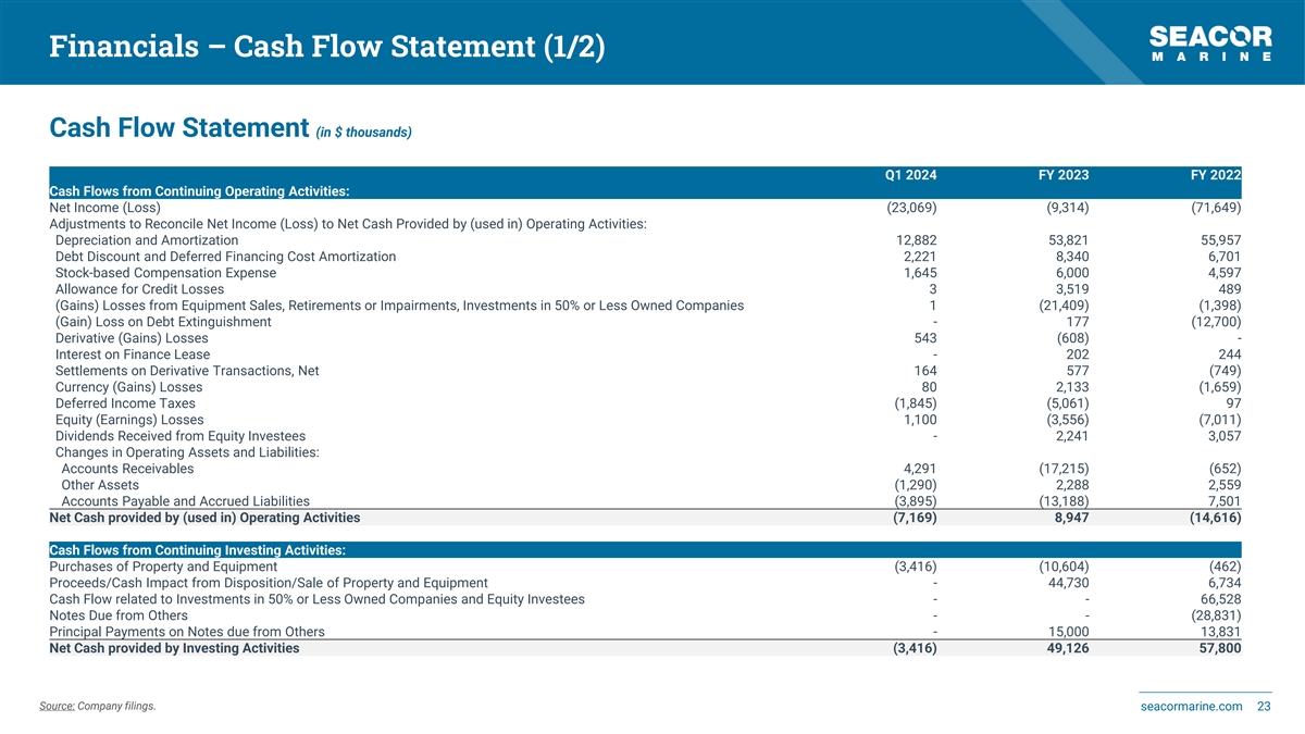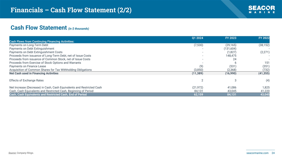 Financials – Cash Flow Statement (1/2) Cash Flow Statement (in $ thousands) Q1 2024 FY 2023 FY 2022 Cash Flows from Continuing Operating Activities: Net Income (Loss) (23,069) (9,314) (71,649) Adjustments to Reconcile Net Income (Loss) to Net Cash Provided by (used in) Operating Activities: Depreciation and Amortization 12,882 53,821 55,957 Debt Discount and Deferred Financing Cost Amortization 2,221 8,340 6,701 Stock-based Compensation Expense 1,645 6,000 4,597 Allowance for Credit Losses 3 3,519 489 (Gains) Losses from Equipment Sales, Retirements or Impairments, Investments in 50% or Less Owned Companies 1 (21,409) (1,398) (Gain) Loss on Debt Extinguishment - 177 (12,700) Derivative (Gains) Losses 543 (608) - Interest on Finance Lease - 202 244 Settlements on Derivative Transactions, Net 164 577 (749) Currency (Gains) Losses 80 2,133 (1,659) Deferred Income Taxes (1,845) (5,061) 97 Equity (Earnings) Losses 1,100 (3,556) (7,011) Dividends Received from Equity Investees - 2,241 3,057 Changes in Operating Assets and Liabilities: Accounts Receivables 4,291 (17,215) (652) Other Assets (1,290) 2,288 2,559 Accounts Payable and Accrued Liabilities (3,895) (13,188) 7,501 Net Cash provided by (used in) Operating Activities (7,169) 8,947 (14,616) Cash Flows from Continuing Investing Activities: Purchases of Property and Equipment (3,416) (10,604) (462) Proceeds/Cash Impact from Disposition/Sale of Property and Equipment - 44,730 6,734 Cash Flow related to Investments in 50% or Less Owned Companies and Equity Investees - - 66,528 Notes Due from Others - - (28,831) Principal Payments on Notes due from Others - 15,000 13,831 Net Cash provided by Investing Activities (3,416) 49,126 57,800 Source: Company filings. seacormarine.com 23