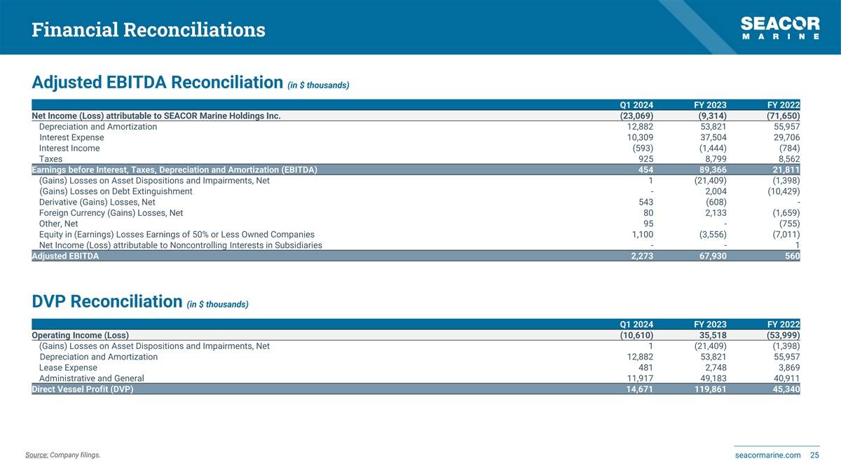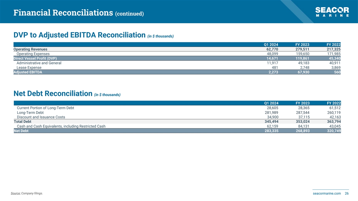 Financial Reconciliations Adjusted EBITDA Reconciliation (in $ thousands) Q1 2024 FY 2023 FY 2022 Net Income (Loss) attributable to SEACOR Marine Holdings Inc. (23,069) (9,314) (71,650) Depreciation and Amortization 12,882 53,821 55,957 Interest Expense 10,309 37,504 29,706 Interest Income (593) (1,444) (784) Taxes 925 8,799 8,562 Earnings before Interest, Taxes, Depreciation and Amortization (EBITDA) 454 89,366 21,811 (Gains) Losses on Asset Dispositions and Impairments, Net 1 (21,409) (1,398) (Gains) Losses on Debt Extinguishment - 2,004 (10,429) Derivative (Gains) Losses, Net 543 (608) - Foreign Currency (Gains) Losses, Net 80 2,133 (1,659) Other, Net 95 - (755) Equity in (Earnings) Losses Earnings of 50% or Less Owned Companies 1,100 (3,556) (7,011) Net Income (Loss) attributable to Noncontrolling Interests in Subsidiaries - - 1 Adjusted EBITDA 2,273 67,930 560 DVP Reconciliation (in $ thousands) Q1 2024 FY 2023 FY 2022 Operating Income (Loss) (10,610) 35,518 (53,999) (Gains) Losses on Asset Dispositions and Impairments, Net 1 (21,409) (1,398) Depreciation and Amortization 12,882 53,821 55,957 Lease Expense 481 2,748 3,869 Administrative and General 11,917 49,183 40,911 Direct Vessel Profit (DVP) 14,671 119,861 45,340 Source: Company filings. seacormarine.com 25