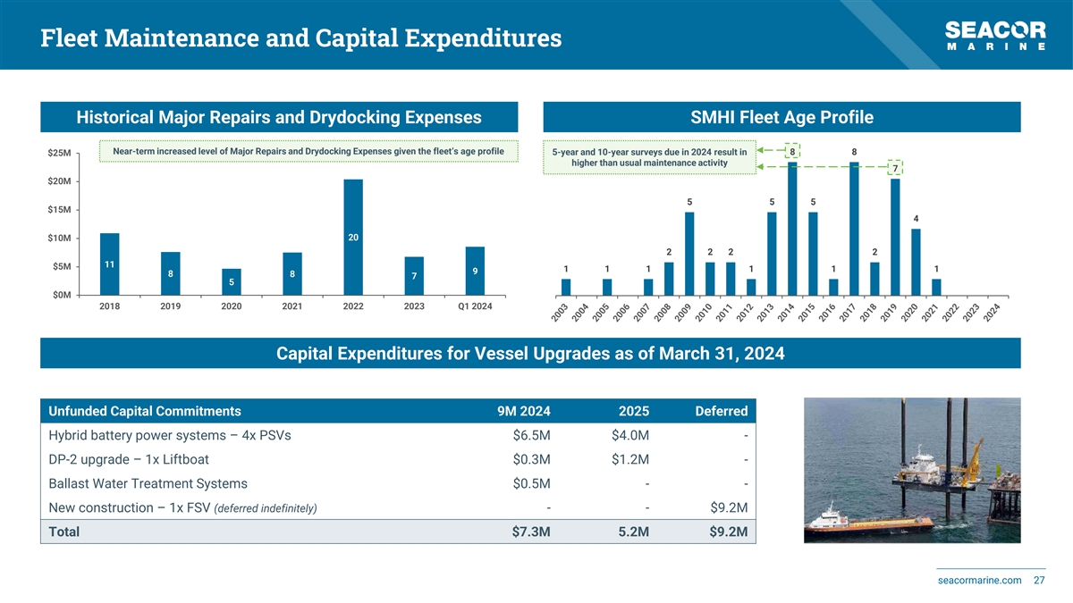 Financial Reconciliations (continued) DVP to Adjusted EBITDA Reconciliation (in $ thousands) Q1 2024 FY 2023 FY 2022 Operating Revenues 62,770 279,511 217,325 Operating Expenses 48,099 159,650 171,985 Direct Vessel Profit (DVP) 14,671 119,861 45,340 Administrative and General 11,917 49,183 40,911 Lease Expense 481 2,748 3,869 Adjusted EBITDA 2,273 67,930 560 Net Debt Reconciliation (in $ thousands) Q1 2024 FY 2023 FY 2022 Current Portion of Long-Term Debt 28,605 28,365 61,512 Long-Term Debt 281,989 287,544 260,119 Discount and Issuance Costs 34,900 37,115 42,163 Total Debt 345,494 353,024 363,794 Cash and Cash Equivalents, including Restricted Cash 62,159 84,131 43,045 Net Debt 283,335 268,893 320,749 Source: Company filings. seacormarine.com 26