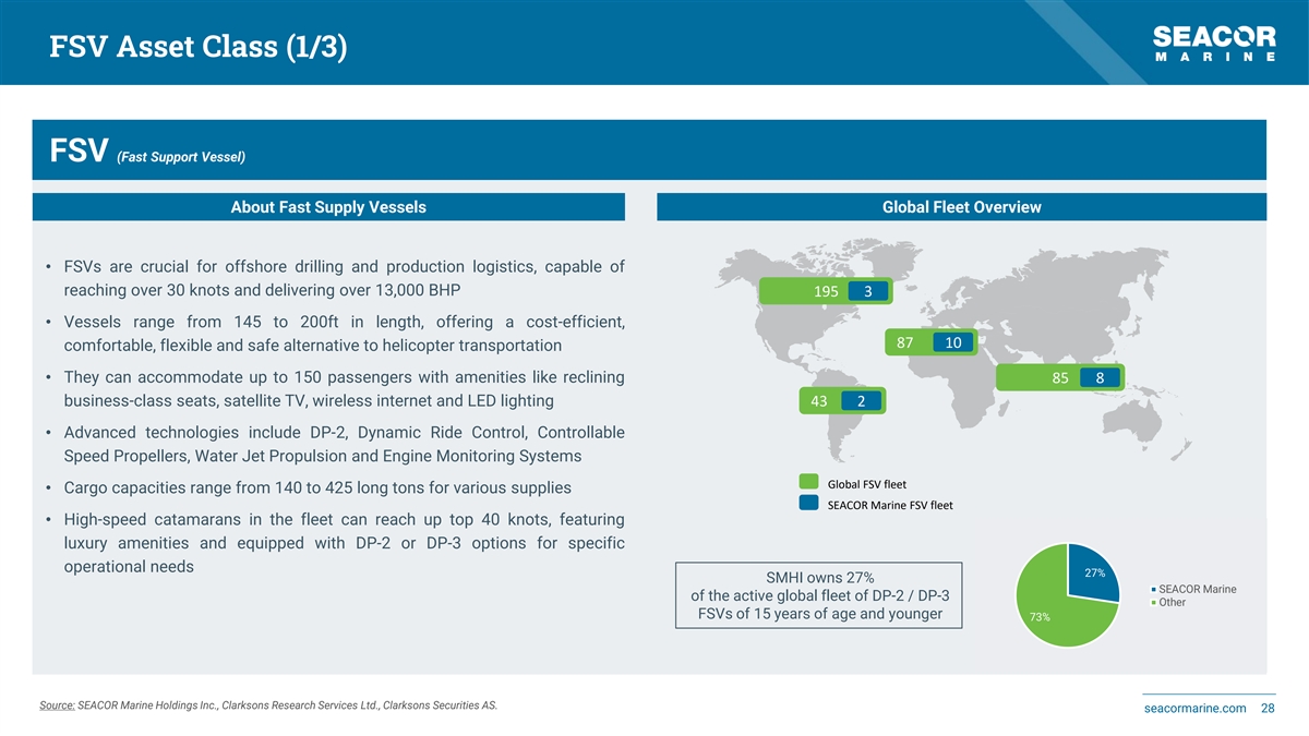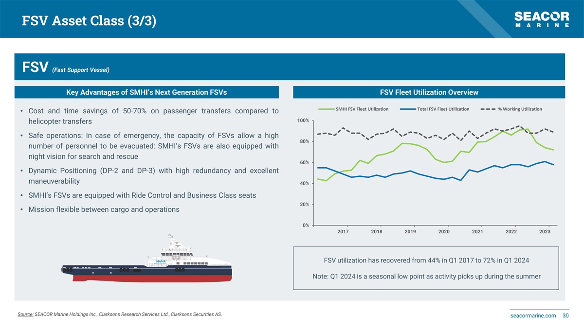 FSV Asset Class (3/3) FSV (Fast Support Vessel) Key Advantages of SMHI’s Next Generation FSVs FSV Fleet Utilization Overview SMHI FSV Fleet Utilization Total FSV Fleet Utilization % Working Utilization • Cost and time savings of 50-70% on passenger transfers compared to 100% helicopter transfers • Safe operations: In case of emergency, the capacity of FSVs allow a high 80% number of personnel to be evacuated: SMHI’s FSVs are also equipped with night vision for search and rescue 60% • Dynamic Positioning (DP-2 and DP-3) with high redundancy and excellent maneuverability 40% • SMHI’s FSVs are equipped with Ride Control and Business Class seats 20% • Mission flexible between cargo and operations 0% 2017 2018 2019 2020 2021 2022 2023 FSV utilization has recovered from 44% in Q1 2017 to 72% in Q1 2024 Note: Q1 2024 is a seasonal low point as activity picks up during the summer Source: SEACOR Marine Holdings Inc., Clarksons Research Services Ltd., Clarksons Securities AS. seacormarine.com 30