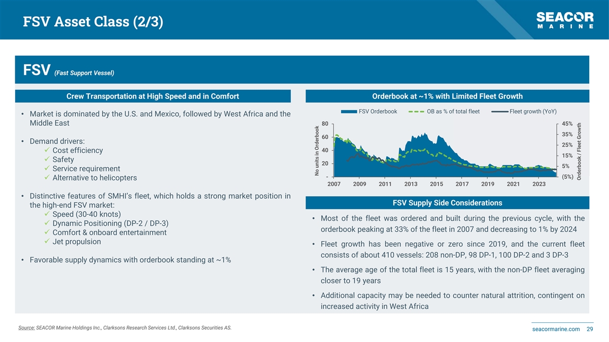 FSV Asset Class (1/3) FSV (Fast Support Vessel) About Fast Supply Vessels Global Fleet Overview • FSVs are crucial for offshore drilling and production logistics, capable of reaching over 30 knots and delivering over 13,000 BHP 195 3 • Vessels range from 145 to 200ft in length, offering a cost-efficient, 87 10 comfortable, flexible and safe alternative to helicopter transportation • They can accommodate up to 150 passengers with amenities like reclining 85 8 business-class seats, satellite TV, wireless internet and LED lighting 43 2 • Advanced technologies include DP-2, Dynamic Ride Control, Controllable Speed Propellers, Water Jet Propulsion and Engine Monitoring Systems Global FSV fleet • Cargo capacities range from 140 to 425 long tons for various supplies SEACOR Marine FSV fleet • High-speed catamarans in the fleet can reach up top 40 knots, featuring luxury amenities and equipped with DP-2 or DP-3 options for specific operational needs 27% SMHI owns 27% SEACOR Marine of the active global fleet of DP-2 / DP-3 Other FSVs of 15 years of age and younger 73% Source: SEACOR Marine Holdings Inc., Clarksons Research Services Ltd., Clarksons Securities AS. seacormarine.com 28