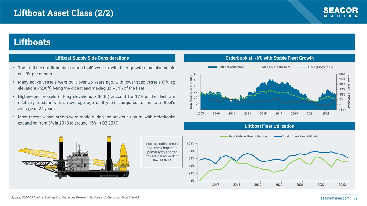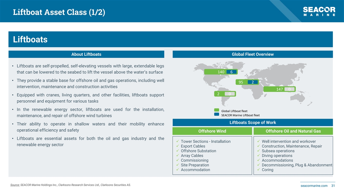 Liftboat Asset Class (1/2) Liftboats About Liftboats Global Fleet Overview • Liftboats are self-propelled, self-elevating vessels with large, extendable legs 140 6 that can be lowered to the seabed to lift the vessel above the water’s surface • They provide a stable base for offshore oil and gas operations, including well 95 2 intervention, maintenance and construction activities 147 0 2 0 • Equipped with cranes, living quarters, and other facilities, liftboats support personnel and equipment for various tasks • In the renewable energy sector, liftboats are used for the installation, Global Liftboat fleet SEACOR Marine Liftboat fleet maintenance, and repair of offshore wind turbines Liftboats Scope of Work • Their ability to operate in shallow waters and their mobility enhance operational efficiency and safety Offshore Wind Offshore Oil and Natural Gas • Liftboats are essential assets for both the oil and gas industry and the ✓ Tower Sections - Installation✓ Well intervention and workover renewable energy sector ✓ Export Cables✓ Construction, Maintenance, Repair ✓ Offshore Substation✓ Subsea operations ✓ Array Cables✓ Diving operations ✓ Commissioning✓ Accommodations ✓ Site Preparation✓ Decommissioning, Plug & Abandonment ✓ Accommodation✓ Coring Source: SEACOR Marine Holdings Inc., Clarksons Research Services Ltd., Clarksons Securities AS. seacormarine.com 31