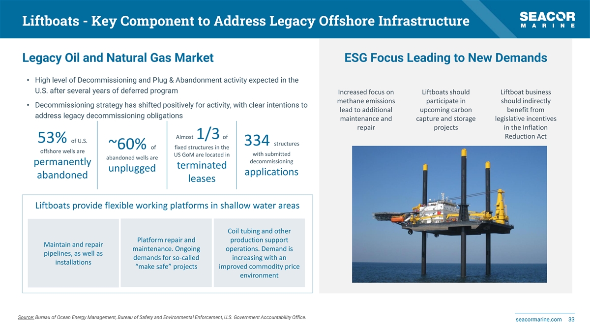 Liftboats - Key Component to Address Legacy Offshore Infrastructure Legacy Oil and Natural Gas Market ESG Focus Leading to New Demands • High level of Decommissioning and Plug & Abandonment activity expected in the U.S. after several years of deferred program Increased focus on Liftboats should Liftboat business methane emissions participate in should indirectly • Decommissioning strategy has shifted positively for activity, with clear intentions to lead to additional upcoming carbon benefit from address legacy decommissioning obligations maintenance and capture and storage legislative incentives repair projects in the Inflation Almost 1/3 of Reduction Act 53% of U.S. 334 structures ~60% of fixed structures in the offshore wells are with submitted US GoM are located in abandoned wells are decommissioning permanently terminated unplugged applications abandoned leases Liftboats provide flexible working platforms in shallow water areas Coil tubing and other Platform repair and production support Maintain and repair maintenance. Ongoing operations. Demand is pipelines, as well as demands for so-called increasing with an installations “make safe” projects improved commodity price environment Source: Bureau of Ocean Energy Management, Bureau of Safety and Environmental Enforcement, U.S. Government Accountability Office. seacormarine.com 33