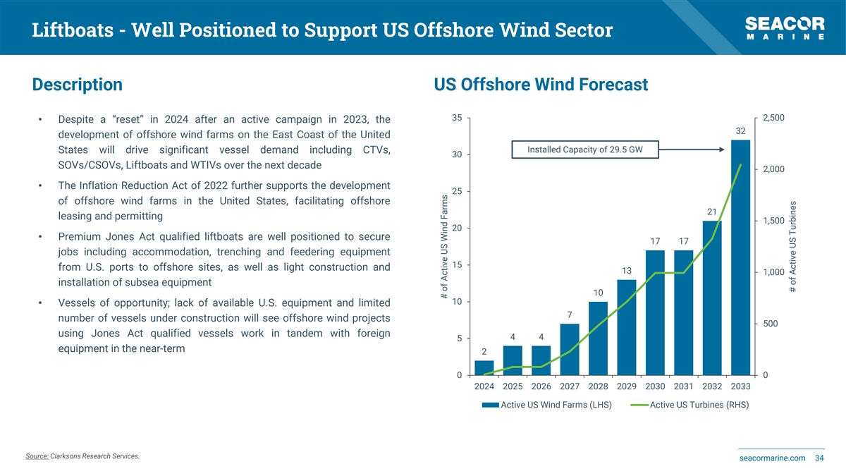 Liftboats - Well Positioned to Support US Offshore Wind Sector Description US Offshore Wind Forecast 35 2,500 • Despite a “reset” in 2024 after an active campaign in 2023, the 32 development of offshore wind farms on the East Coast of the United Installed Capacity of 29.5 GW States will drive significant vessel demand including CTVs, 30 SOVs/CSOVs, Liftboats and WTIVs over the next decade 2,000 • The Inflation Reduction Act of 2022 further supports the development 25 of offshore wind farms in the United States, facilitating offshore 21 leasing and permitting 1,500 20 • Premium Jones Act qualified liftboats are well positioned to secure 17 17 jobs including accommodation, trenching and feedering equipment 15 from U.S. ports to offshore sites, as well as light construction and 13 1,000 installation of subsea equipment 10 10 • Vessels of opportunity; lack of available U.S. equipment and limited 7 number of vessels under construction will see offshore wind projects 500 using Jones Act qualified vessels work in tandem with foreign 4 4 5 equipment in the near-term 2 0 0 2024 2025 2026 2027 2028 2029 2030 2031 2032 2033 Active US Wind Farms (LHS) Active US Turbines (RHS) Source: Clarksons Research Services. seacormarine.com 34 # of Active US Wind Farms # of Active US Turbines