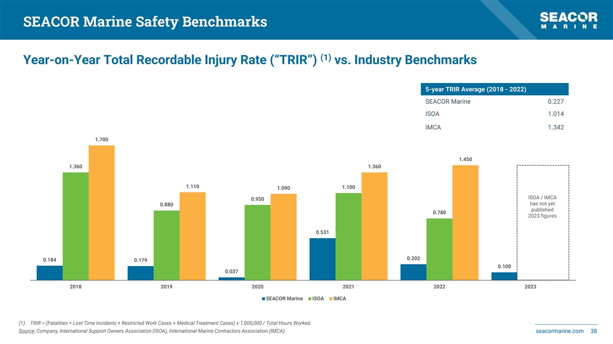 SEACOR Marine Safety Benchmarks (1) Year-on-Year Total Recordable Injury Rate (“TRIR”) vs. Industry Benchmarks 5-year TRIR Average (2018 - 2022) SEACOR Marine 0.227 ISOA 1.014 IMCA 1.342 1.700 1.450 1.360 1.360 1.110 1.100 1.090 ISOA / IMCA 0.950 has not yet 0.880 published 0.780 2023 figures 0.531 0.202 0.184 0.179 0.100 0.037 2018 2019 2020 2021 2022 2023 SEACOR Marine ISOA IMCA (1) TRIR = (Fatalities + Lost Time Incidents + Restricted Work Cases + Medical Treatment Cases) x 1,000,000 / Total Hours Worked. Source: Company, International Support Owners Association (ISOA), International Marine Contractors Association (IMCA). seacormarine.com 38