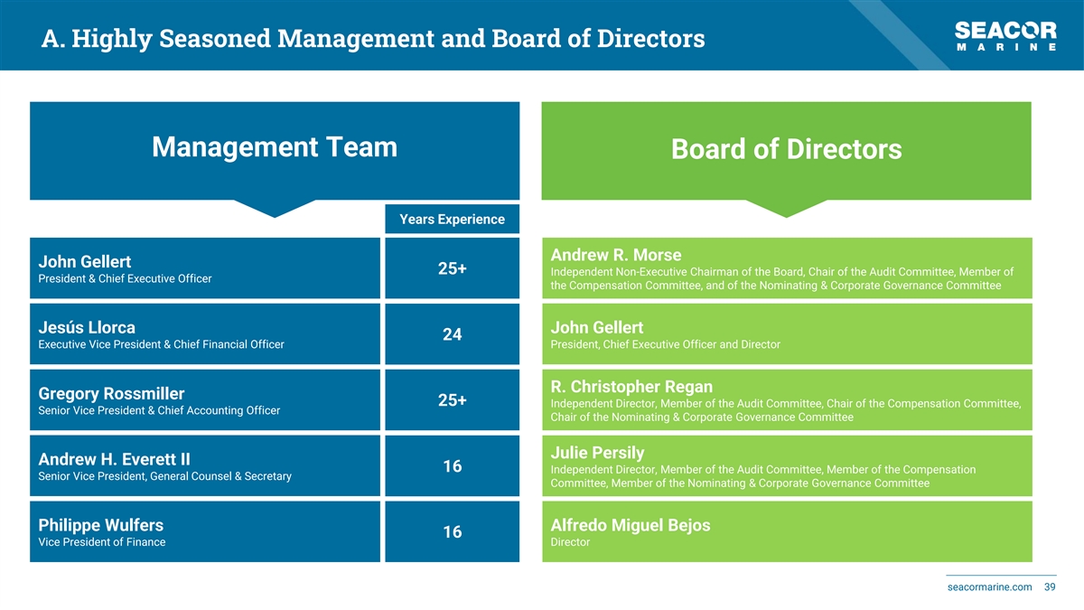 A. Highly Seasoned Management and Board of Directors Management Team Board of Directors Years Experience Andrew R. Morse John Gellert 25+ Independent Non-Executive Chairman of the Board, Chair of the Audit Committee, Member of President & Chief Executive Officer the Compensation Committee, and of the Nominating & Corporate Governance Committee Jesús Llorca John Gellert 24 Executive Vice President & Chief Financial Officer President, Chief Executive Officer and Director R. Christopher Regan Gregory Rossmiller 25+ Independent Director, Member of the Audit Committee, Chair of the Compensation Committee, Senior Vice President & Chief Accounting Officer Chair of the Nominating & Corporate Governance Committee Julie Persily Andrew H. Everett II 16 Independent Director, Member of the Audit Committee, Member of the Compensation Senior Vice President, General Counsel & Secretary Committee, Member of the Nominating & Corporate Governance Committee Philippe Wulfers Alfredo Miguel Bejos 16 Vice President of Finance Director seacormarine.com 39