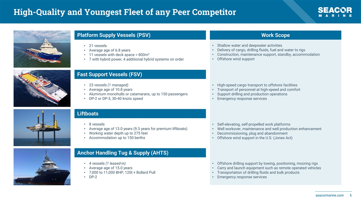 High-Quality and Youngest Fleet of any Peer Competitor Platform Supply Vessels (PSV) Work Scope • Shallow water and deepwater activities • 21 vessels • Delivery of cargo, drilling fluids, fuel and water to rigs • Average age of 6.8 years 2 • Construction, maintenance support, standby, accommodation • 11 vessels with deck space > 800m • Offshore wind support • 7 with hybrid power, 4 additional hybrid systems on order Fast Support Vessels (FSV) • 23 vessels (1 managed)• High-speed cargo transport to offshore facilities • Average age of 10.8 years• Transport of personnel at high-speed and comfort • Aluminum monohulls or catamarans, up to 150 passengers• Support drilling and production operations • DP-2 or DP-3, 30-40 knots speed• Emergency response services Liftboats • 8 vessels• Self-elevating, self-propelled work platforms • Average age of 13.0 years (9.3 years for premium liftboats)• Well workover, maintenance and well production enhancement • Working water depth up to 275 feet• Decommissioning, plug and abandonment • Accommodation up to 150 berths• Offshore wind support in the U.S. (Jones Act) Anchor Handling Tug & Supply (AHTS) • 4 vessels (1 leased-in)• Offshore drilling support by towing, positioning, mooring rigs • Average age of 15.0 years• Carry and launch equipment such as remote operated vehicles • 7,000 to 11,000 BHP, 120t + Bollard Pull• Transportation of drilling fluids and bulk products • DP-2• Emergency response services seacormarine.com 5