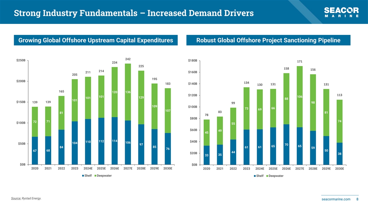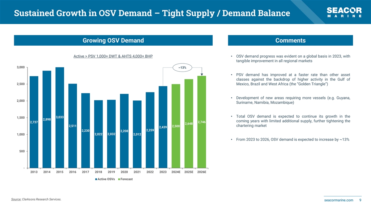 Strong Industry Fundamentals – Increased Demand Drivers Growing Global Offshore Upstream Capital Expenditures Robust Global Offshore Project Sanctioning Pipeline 242 $250B $180B 171 234 225 158 156 214 $160B 211 205 195 $200B 134 183 $140B 131 131 130 165 120 136 $120B 113 101 106 129 101 88 101 $150B 139 139 98 99 109 $100B 66 73 69 107 83 81 81 78 $80B 74 71 72 $100B 55 $60B 49 45 112 114 $40B 110 106 104 $50B 97 70 65 65 85 84 61 61 59 76 68 50 67 44 $20B 38 35 33 $0B $0B 2020 2021 2022 2023 2024E 2025E 2026E 2027E 2028E 2029E 2030E 2020 2021 2022 2023 2024E 2025E 2026E 2027E 2028E 2029E 2030E Shelf Deepwater Shelf Deepwater Source: Rystad Energy. seacormarine.com 8 8