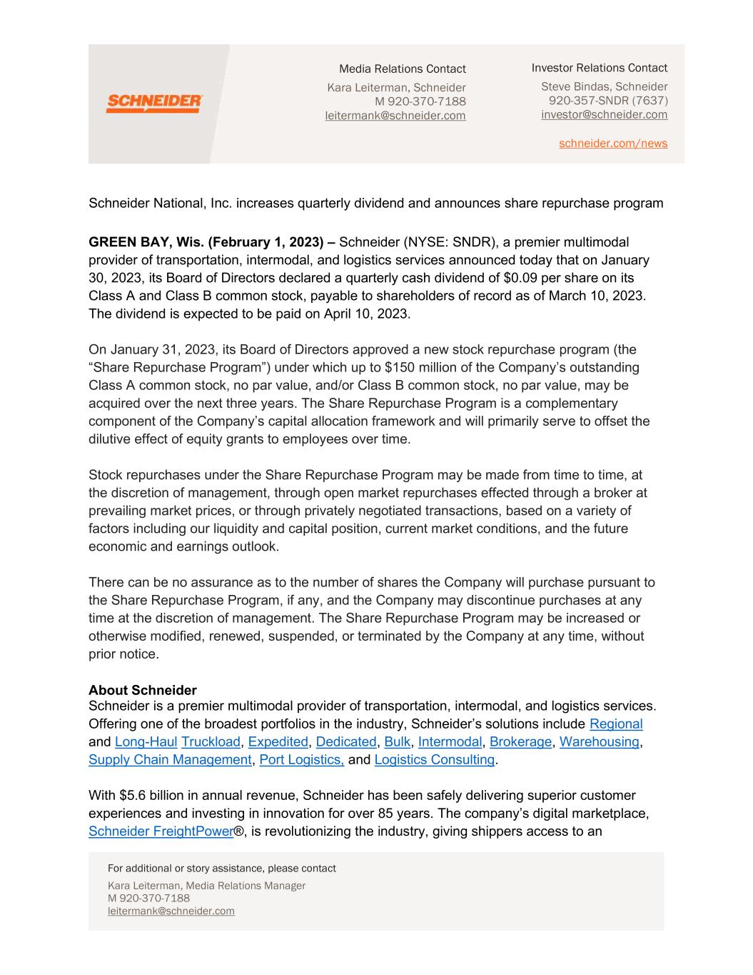 Media Relations Contact Kara Leiterman, Schneider M 920-370-7188 leitermank@schneider.com For additional or story assistance, please contact Kara Leiterman, Media Relations Manager M 920-370-7188 leitermank@schneider.com Investor Relations Contact Steve Bindas, Schneider 920-357-SNDR (7637) investor@schneider.com schneider.com/news Schneider National, Inc. increases quarterly dividend and announces share repurchase program GREEN BAY, Wis. (February 1, 2023) – Schneider (NYSE: SNDR), a premier multimodal provider of transportation, intermodal, and logistics services announced today that on January 30, 2023, its Board of Directors declared a quarterly cash dividend of $0.09 per share on its Class A and Class B common stock, payable to shareholders of record as of March 10, 2023. The dividend is expected to be paid on April 10, 2023. On January 31, 2023, its Board of Directors approved a new stock repurchase program (the “Share Repurchase Program”) under which up to $150 million of the Company’s outstanding Class A common stock, no par value, and/or Class B common stock, no par value, may be acquired over the next three years. The Share Repurchase Program is a complementary component of the Company’s capital allocation framework and will primarily serve to offset the dilutive effect of equity grants to employees over time. Stock repurchases under the Share Repurchase Program may be made from time to time, at the discretion of management, through open market repurchases effected through a broker at prevailing market prices, or through privately negotiated transactions, based on a variety of factors including our liquidity and capital position, current market conditions, and the future economic and earnings outlook. There can be no assurance as to the number of shares the Company will purchase pursuant to the Share Repurchase Program, if any, and the Company may discontinue purchases at any time at the discretion of management. The Share Repurchase Program may be increased or otherwise modified, renewed, suspended, or terminated by the Company at any time, without prior notice. About Schneider Schneider is a premier multimodal provider of transportation, intermodal, and logistics services. Offering one of the broadest portfolios in the industry, Schneider’s solutions include Regional and Long-Haul Truckload, Expedited, Dedicated, Bulk, Intermodal, Brokerage, Warehousing, Supply Chain Management, Port Logistics, and Logistics Consulting. With $5.6 billion in annual revenue, Schneider has been safely delivering superior customer experiences and investing in innovation for over 85 years. The company’s digital marketplace, Schneider FreightPower®, is revolutionizing the industry, giving shippers access to an