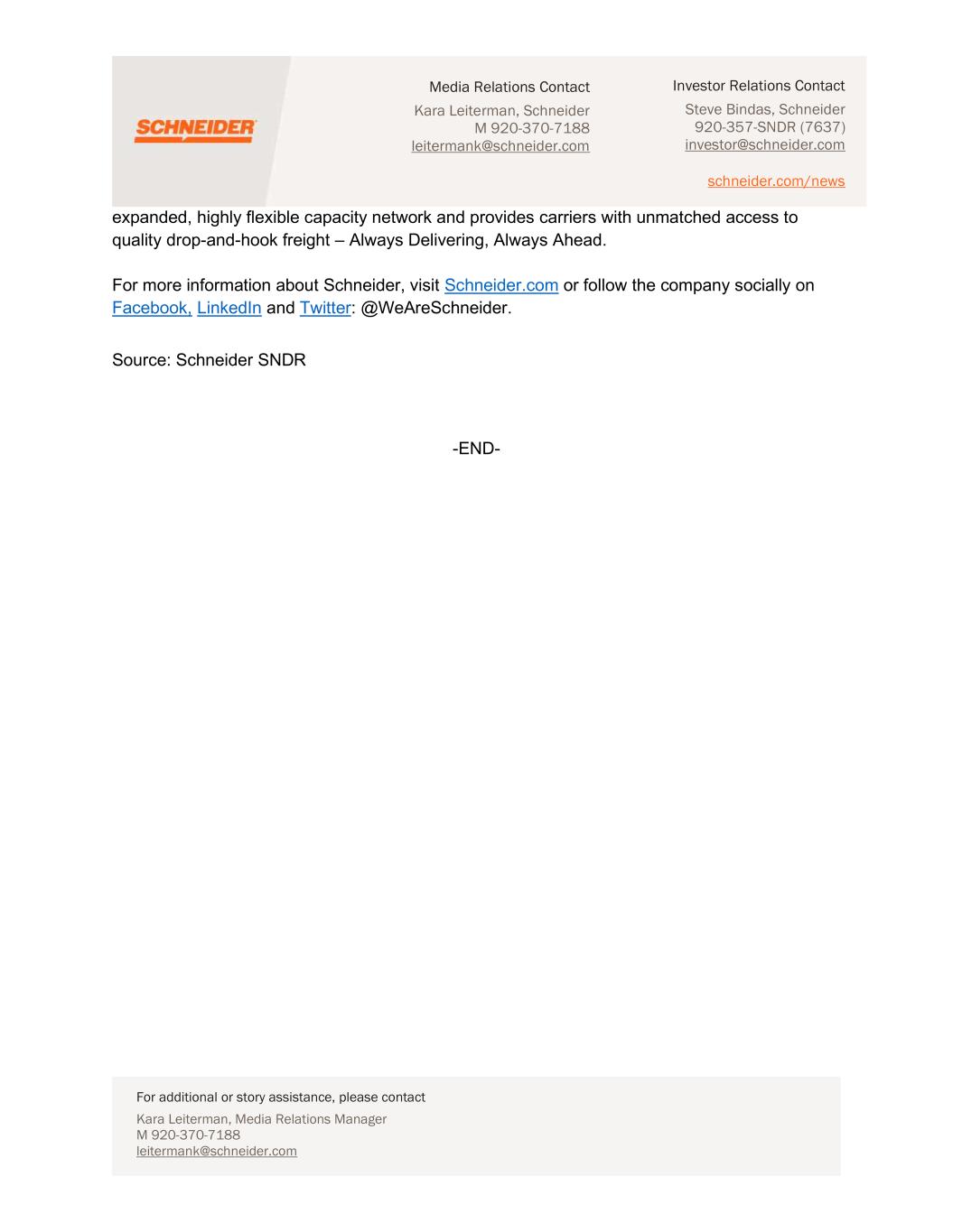 Media Relations Contact Kara Leiterman, Schneider M 920-370-7188 leitermank@schneider.com For additional or story assistance, please contact Kara Leiterman, Media Relations Manager M 920-370-7188 leitermank@schneider.com Investor Relations Contact Steve Bindas, Schneider 920-357-SNDR (7637) investor@schneider.com schneider.com/news expanded, highly flexible capacity network and provides carriers with unmatched access to quality drop-and-hook freight – Always Delivering, Always Ahead. For more information about Schneider, visit Schneider.com or follow the company socially on Facebook, LinkedIn and Twitter: @WeAreSchneider. Source: Schneider SNDR -END-