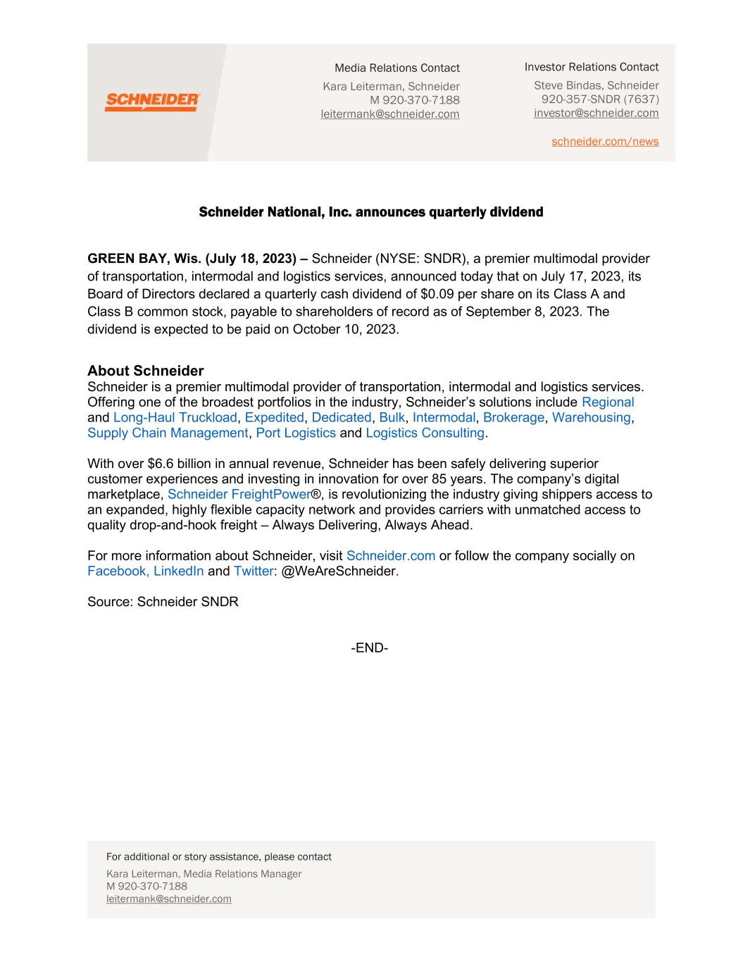 Media Relations Contact Kara Leiterman, Schneider M 920-370-7188 leitermank@schneider.com For additional or story assistance, please contact Kara Leiterman, Media Relations Manager M 920-370-7188 leitermank@schneider.com Investor Relations Contact Steve Bindas, Schneider 920-357-SNDR (7637) investor@schneider.com schneider.com/news Schneider National, Inc. announces quarterly dividend GREEN BAY, Wis. (July 18, 2023) – Schneider (NYSE: SNDR), a premier multimodal provider of transportation, intermodal and logistics services, announced today that on July 17, 2023, its Board of Directors declared a quarterly cash dividend of $0.09 per share on its Class A and Class B common stock, payable to shareholders of record as of September 8, 2023. The dividend is expected to be paid on October 10, 2023. About Schneider Schneider is a premier multimodal provider of transportation, intermodal and logistics services. Offering one of the broadest portfolios in the industry, Schneider’s solutions include Regional and Long-Haul Truckload, Expedited, Dedicated, Bulk, Intermodal, Brokerage, Warehousing, Supply Chain Management, Port Logistics and Logistics Consulting. With over $6.6 billion in annual revenue, Schneider has been safely delivering superior customer experiences and investing in innovation for over 85 years. The company’s digital marketplace, Schneider FreightPower®, is revolutionizing the industry giving shippers access to an expanded, highly flexible capacity network and provides carriers with unmatched access to quality drop-and-hook freight – Always Delivering, Always Ahead. For more information about Schneider, visit Schneider.com or follow the company socially on Facebook, LinkedIn and Twitter: @WeAreSchneider. Source: Schneider SNDR -END-