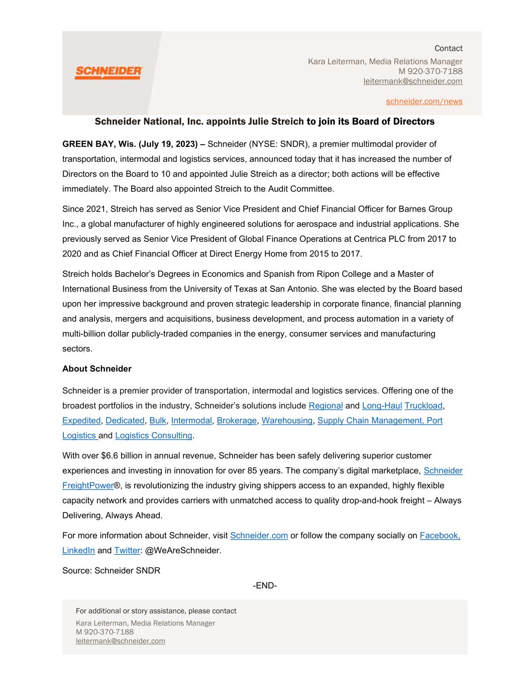 Contact Kara Leiterman, Media Relations Manager M 920-370-7188 leitermank@schneider.com schneider.com/news For additional or story assistance, please contact Kara Leiterman, Media Relations Manager M 920-370-7188 leitermank@schneider.com Schneider National, Inc. appoints Julie Streich to join its Board of Directors GREEN BAY, Wis. (July 19, 2023) – Schneider (NYSE: SNDR), a premier multimodal provider of transportation, intermodal and logistics services, announced today that it has increased the number of Directors on the Board to 10 and appointed Julie Streich as a director; both actions will be effective immediately. The Board also appointed Streich to the Audit Committee. Since 2021, Streich has served as Senior Vice President and Chief Financial Officer for Barnes Group Inc., a global manufacturer of highly engineered solutions for aerospace and industrial applications. She previously served as Senior Vice President of Global Finance Operations at Centrica PLC from 2017 to 2020 and as Chief Financial Officer at Direct Energy Home from 2015 to 2017. Streich holds Bachelor’s Degrees in Economics and Spanish from Ripon College and a Master of International Business from the University of Texas at San Antonio. She was elected by the Board based upon her impressive background and proven strategic leadership in corporate finance, financial planning and analysis, mergers and acquisitions, business development, and process automation in a variety of multi-billion dollar publicly-traded companies in the energy, consumer services and manufacturing sectors. About Schneider Schneider is a premier provider of transportation, intermodal and logistics services. Offering one of the broadest portfolios in the industry, Schneider’s solutions include Regional and Long-Haul Truckload, Expedited, Dedicated, Bulk, Intermodal, Brokerage, Warehousing, Supply Chain Management, Port Logistics and Logistics Consulting. With over $6.6 billion in annual revenue, Schneider has been safely delivering superior customer experiences and investing in innovation for over 85 years. The company’s digital marketplace, Schneider FreightPower®, is revolutionizing the industry giving shippers access to an expanded, highly flexible capacity network and provides carriers with unmatched access to quality drop-and-hook freight – Always Delivering, Always Ahead. For more information about Schneider, visit Schneider.com or follow the company socially on Facebook, LinkedIn and Twitter: @WeAreSchneider. Source: Schneider SNDR -END-