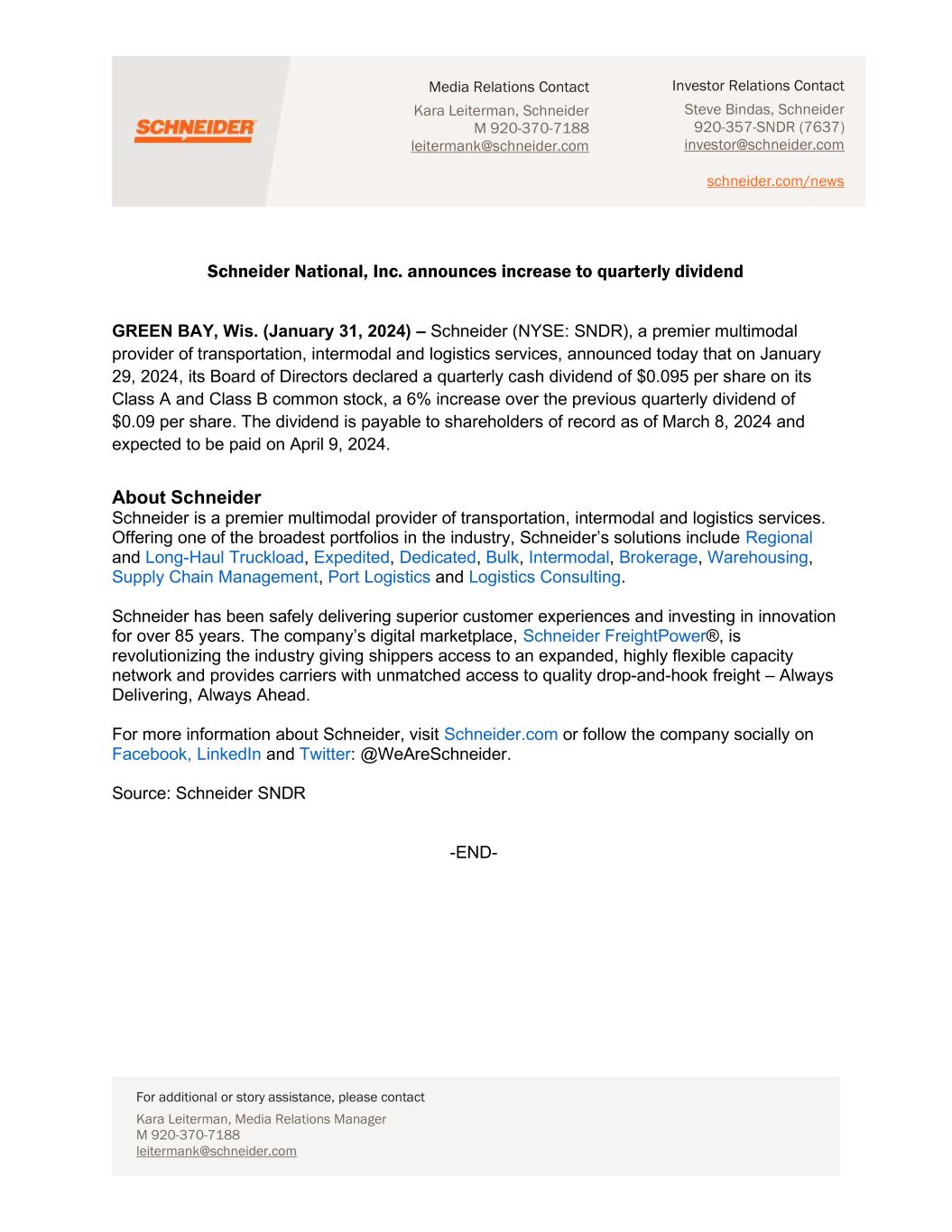 Media Relations Contact Kara Leiterman, Schneider M 920-370-7188 leitermank@schneider.com For additional or story assistance, please contact Kara Leiterman, Media Relations Manager M 920-370-7188 leitermank@schneider.com Investor Relations Contact Steve Bindas, Schneider 920-357-SNDR (7637) investor@schneider.com schneider.com/news Schneider National, Inc. announces increase to quarterly dividend GREEN BAY, Wis. (January 31, 2024) – Schneider (NYSE: SNDR), a premier multimodal provider of transportation, intermodal and logistics services, announced today that on January 29, 2024, its Board of Directors declared a quarterly cash dividend of $0.095 per share on its Class A and Class B common stock, a 6% increase over the previous quarterly dividend of $0.09 per share. The dividend is payable to shareholders of record as of March 8, 2024 and expected to be paid on April 9, 2024. About Schneider Schneider is a premier multimodal provider of transportation, intermodal and logistics services. Offering one of the broadest portfolios in the industry, Schneider’s solutions include Regional and Long-Haul Truckload, Expedited, Dedicated, Bulk, Intermodal, Brokerage, Warehousing, Supply Chain Management, Port Logistics and Logistics Consulting. Schneider has been safely delivering superior customer experiences and investing in innovation for over 85 years. The company’s digital marketplace, Schneider FreightPower®, is revolutionizing the industry giving shippers access to an expanded, highly flexible capacity network and provides carriers with unmatched access to quality drop-and-hook freight – Always Delivering, Always Ahead. For more information about Schneider, visit Schneider.com or follow the company socially on Facebook, LinkedIn and Twitter: @WeAreSchneider. Source: Schneider SNDR -END-