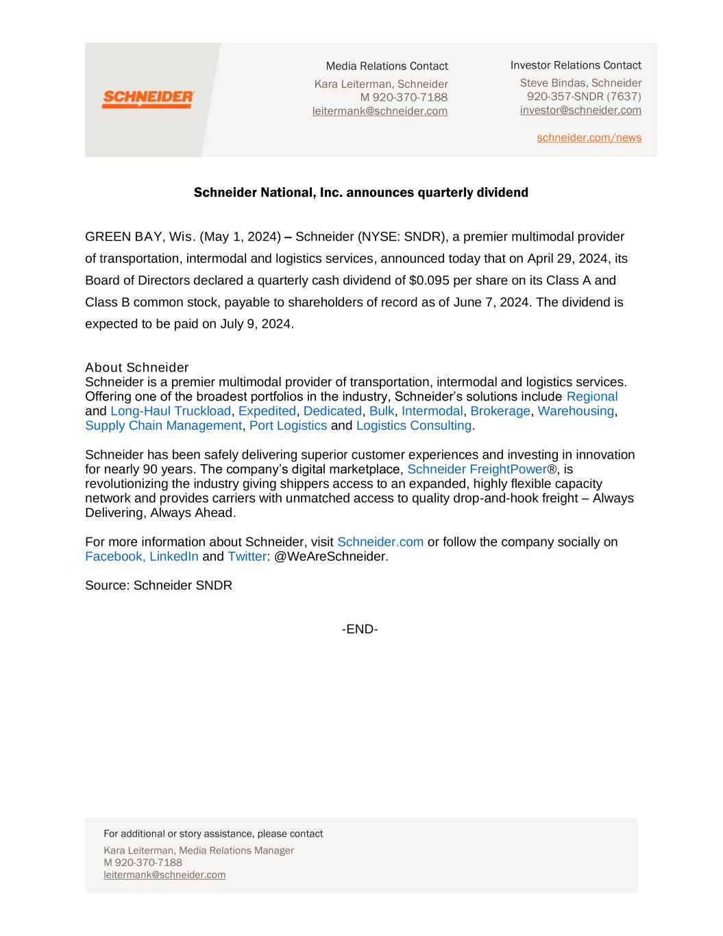 Media Relations Contact Kara Leiterman, Schneider M 920-370-7188 leitermank@schneider.com For additional or story assistance, please contact Kara Leiterman, Media Relations Manager M 920-370-7188 leitermank@schneider.com Investor Relations Contact Steve Bindas, Schneider 920-357-SNDR (7637) investor@schneider.com schneider.com/news Schneider National, Inc. announces quarterly dividend GREEN BAY, Wis. (May 1, 2024) – Schneider (NYSE: SNDR), a premier multimodal provider of transportation, intermodal and logistics services, announced today that on April 29, 2024, its Board of Directors declared a quarterly cash dividend of $0.095 per share on its Class A and Class B common stock, payable to shareholders of record as of June 7, 2024. The dividend is expected to be paid on July 9, 2024. About Schneider Schneider is a premier multimodal provider of transportation, intermodal and logistics services. Offering one of the broadest portfolios in the industry, Schneider’s solutions include Regional and Long-Haul Truckload, Expedited, Dedicated, Bulk, Intermodal, Brokerage, Warehousing, Supply Chain Management, Port Logistics and Logistics Consulting. Schneider has been safely delivering superior customer experiences and investing in innovation for nearly 90 years. The company’s digital marketplace, Schneider FreightPower®, is revolutionizing the industry giving shippers access to an expanded, highly flexible capacity network and provides carriers with unmatched access to quality drop-and-hook freight – Always Delivering, Always Ahead. For more information about Schneider, visit Schneider.com or follow the company socially on Facebook, LinkedIn and Twitter: @WeAreSchneider. Source: Schneider SNDR -END-