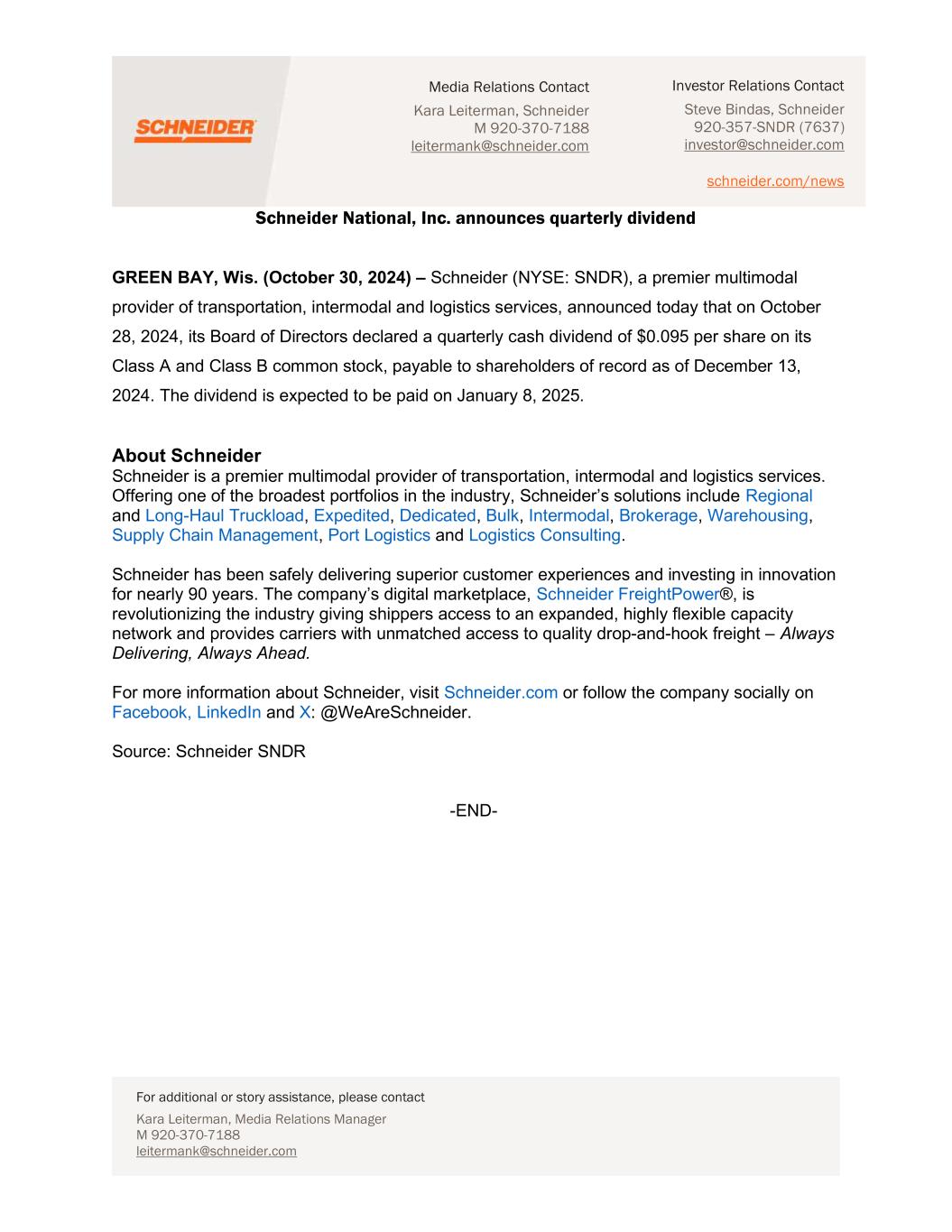 Media Relations Contact Kara Leiterman, Schneider M 920-370-7188 leitermank@schneider.com For additional or story assistance, please contact Kara Leiterman, Media Relations Manager M 920-370-7188 leitermank@schneider.com Investor Relations Contact Steve Bindas, Schneider 920-357-SNDR (7637) investor@schneider.com schneider.com/news Schneider National, Inc. announces quarterly dividend GREEN BAY, Wis. (October 30, 2024) – Schneider (NYSE: SNDR), a premier multimodal provider of transportation, intermodal and logistics services, announced today that on October 28, 2024, its Board of Directors declared a quarterly cash dividend of $0.095 per share on its Class A and Class B common stock, payable to shareholders of record as of December 13, 2024. The dividend is expected to be paid on January 8, 2025. About Schneider Schneider is a premier multimodal provider of transportation, intermodal and logistics services. Offering one of the broadest portfolios in the industry, Schneider’s solutions include Regional and Long-Haul Truckload, Expedited, Dedicated, Bulk, Intermodal, Brokerage, Warehousing, Supply Chain Management, Port Logistics and Logistics Consulting. Schneider has been safely delivering superior customer experiences and investing in innovation for nearly 90 years. The company’s digital marketplace, Schneider FreightPower®, is revolutionizing the industry giving shippers access to an expanded, highly flexible capacity network and provides carriers with unmatched access to quality drop-and-hook freight – Always Delivering, Always Ahead. For more information about Schneider, visit Schneider.com or follow the company socially on Facebook, LinkedIn and X: @WeAreSchneider. Source: Schneider SNDR -END-