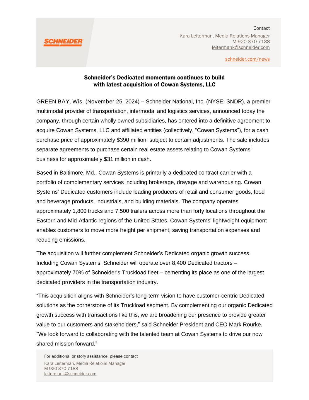 Contact Kara Leiterman, Media Relations Manager M 920-370-7188 leitermank@schneider.com schneider.com/news For additional or story assistance, please contact Kara Leiterman, Media Relations Manager M 920-370-7188 leitermank@schneider.com Schneider’s Dedicated momentum continues to build with latest acquisition of Cowan Systems, LLC GREEN BAY, Wis. (November 25, 2024) – Schneider National, Inc. (NYSE: SNDR), a premier multimodal provider of transportation, intermodal and logistics services, announced today the company, through certain wholly owned subsidiaries, has entered into a definitive agreement to acquire Cowan Systems, LLC and affiliated entities (collectively, “Cowan Systems”), for a cash purchase price of approximately $390 million, subject to certain adjustments. The sale includes separate agreements to purchase certain real estate assets relating to Cowan Systems’ business for approximately $31 million in cash. Based in Baltimore, Md., Cowan Systems is primarily a dedicated contract carrier with a portfolio of complementary services including brokerage, drayage and warehousing. Cowan Systems’ Dedicated customers include leading producers of retail and consumer goods, food and beverage products, industrials, and building materials. The company operates approximately 1,800 trucks and 7,500 trailers across more than forty locations throughout the Eastern and Mid-Atlantic regions of the United States. Cowan Systems’ lightweight equipment enables customers to move more freight per shipment, saving transportation expenses and reducing emissions. The acquisition will further complement Schneider’s Dedicated organic growth success. Including Cowan Systems, Schneider will operate over 8,400 Dedicated tractors – approximately 70% of Schneider’s Truckload fleet – cementing its place as one of the largest dedicated providers in the transportation industry. “This acquisition aligns with Schneider’s long-term vision to have customer-centric Dedicated solutions as the cornerstone of its Truckload segment. By complementing our organic Dedicated growth success with transactions like this, we are broadening our presence to provide greater value to our customers and stakeholders,” said Schneider President and CEO Mark Rourke. “We look forward to collaborating with the talented team at Cowan Systems to drive our now shared mission forward.”
