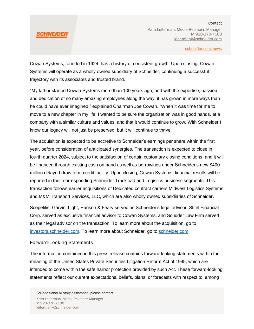 Contact Kara Leiterman, Media Relations Manager M 920-370-7188 leitermank@schneider.com schneider.com/news For additional or story assistance, please contact Kara Leiterman, Media Relations Manager M 920-370-7188 leitermank@schneider.com Cowan Systems, founded in 1924, has a history of consistent growth. Upon closing, Cowan Systems will operate as a wholly owned subsidiary of Schneider, continuing a successful trajectory with its associates and trusted brand. “My father started Cowan Systems more than 100 years ago, and with the expertise, passion and dedication of so many amazing employees along the way, it has grown in more ways than he could have ever imagined,” explained Chairman Joe Cowan. “When it was time for me to move to a new chapter in my life, I wanted to be sure the organization was in good hands, at a company with a similar culture and values, and that it would continue to grow. With Schneider I know our legacy will not just be preserved, but it will continue to thrive.” The acquisition is expected to be accretive to Schneider’s earnings per share within the first year, before consideration of anticipated synergies. The transaction is expected to close in fourth quarter 2024, subject to the satisfaction of certain customary closing conditions, and it will be financed through existing cash on hand as well as borrowings under Schneider’s new $400 million delayed draw term credit facility. Upon closing, Cowan Systems’ financial results will be reported in their corresponding Schneider Truckload and Logistics business segments. This transaction follows earlier acquisitions of Dedicated contract carriers Midwest Logistics Systems and M&M Transport Services, LLC, which are also wholly owned subsidiaries of Schneider. Scopelitis, Garvin, Light, Hanson & Feary served as Schneider’s legal advisor. Stifel Financial Corp. served as exclusive financial advisor to Cowan Systems, and Scudder Law Firm served as their legal advisor on the transaction. To learn more about the acquisition, go to investors.schneider.com. To learn more about Schneider, go to schneider.com. Forward-Looking Statements The information contained in this press release contains forward-looking statements within the meaning of the United States Private Securities Litigation Reform Act of 1995, which are intended to come within the safe harbor protection provided by such Act. These forward-looking statements reflect our current expectations, beliefs, plans, or forecasts with respect to, among
