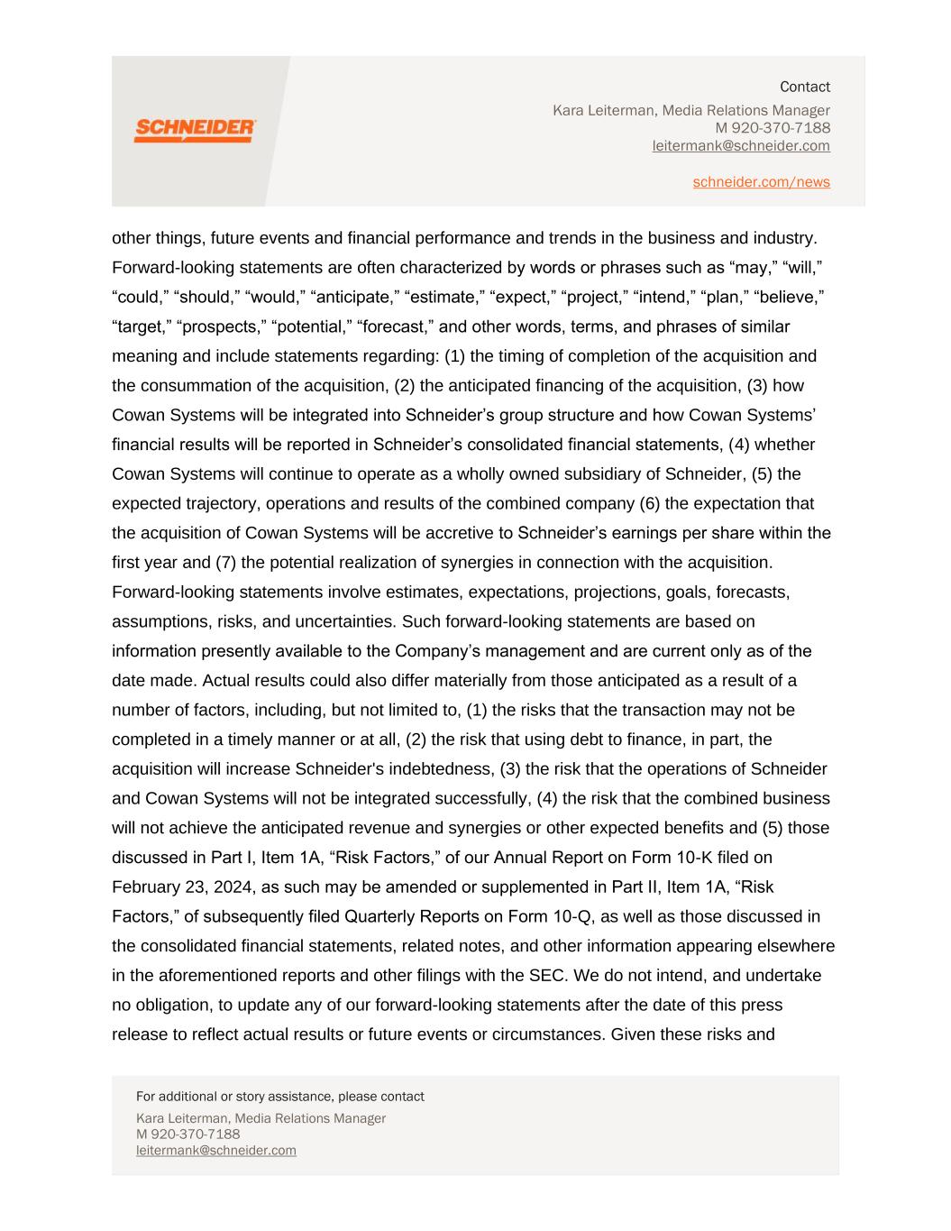Contact Kara Leiterman, Media Relations Manager M 920-370-7188 leitermank@schneider.com schneider.com/news For additional or story assistance, please contact Kara Leiterman, Media Relations Manager M 920-370-7188 leitermank@schneider.com other things, future events and financial performance and trends in the business and industry. Forward-looking statements are often characterized by words or phrases such as “may,” “will,” “could,” “should,” “would,” “anticipate,” “estimate,” “expect,” “project,” “intend,” “plan,” “believe,” “target,” “prospects,” “potential,” “forecast,” and other words, terms, and phrases of similar meaning and include statements regarding: (1) the timing of completion of the acquisition and the consummation of the acquisition, (2) the anticipated financing of the acquisition, (3) how Cowan Systems will be integrated into Schneider’s group structure and how Cowan Systems’ financial results will be reported in Schneider’s consolidated financial statements, (4) whether Cowan Systems will continue to operate as a wholly owned subsidiary of Schneider, (5) the expected trajectory, operations and results of the combined company (6) the expectation that the acquisition of Cowan Systems will be accretive to Schneider’s earnings per share within the first year and (7) the potential realization of synergies in connection with the acquisition. Forward-looking statements involve estimates, expectations, projections, goals, forecasts, assumptions, risks, and uncertainties. Such forward-looking statements are based on information presently available to the Company’s management and are current only as of the date made. Actual results could also differ materially from those anticipated as a result of a number of factors, including, but not limited to, (1) the risks that the transaction may not be completed in a timely manner or at all, (2) the risk that using debt to finance, in part, the acquisition will increase Schneider's indebtedness, (3) the risk that the operations of Schneider and Cowan Systems will not be integrated successfully, (4) the risk that the combined business will not achieve the anticipated revenue and synergies or other expected benefits and (5) those discussed in Part I, Item 1A, “Risk Factors,” of our Annual Report on Form 10-K filed on February 23, 2024, as such may be amended or supplemented in Part II, Item 1A, “Risk Factors,” of subsequently filed Quarterly Reports on Form 10-Q, as well as those discussed in the consolidated financial statements, related notes, and other information appearing elsewhere in the aforementioned reports and other filings with the SEC. We do not intend, and undertake no obligation, to update any of our forward-looking statements after the date of this press release to reflect actual results or future events or circumstances. Given these risks and