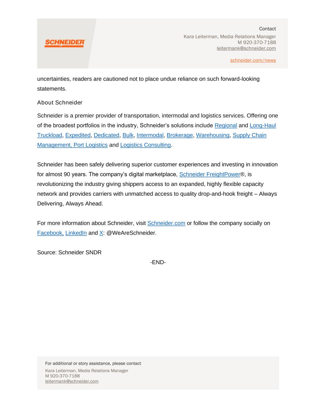 Contact Kara Leiterman, Media Relations Manager M 920-370-7188 leitermank@schneider.com schneider.com/news For additional or story assistance, please contact Kara Leiterman, Media Relations Manager M 920-370-7188 leitermank@schneider.com uncertainties, readers are cautioned not to place undue reliance on such forward-looking statements. About Schneider Schneider is a premier provider of transportation, intermodal and logistics services. Offering one of the broadest portfolios in the industry, Schneider’s solutions include Regional and Long-Haul Truckload, Expedited, Dedicated, Bulk, Intermodal, Brokerage, Warehousing, Supply Chain Management, Port Logistics and Logistics Consulting. Schneider has been safely delivering superior customer experiences and investing in innovation for almost 90 years. The company’s digital marketplace, Schneider FreightPower®, is revolutionizing the industry giving shippers access to an expanded, highly flexible capacity network and provides carriers with unmatched access to quality drop-and-hook freight – Always Delivering, Always Ahead. For more information about Schneider, visit Schneider.com or follow the company socially on Facebook, LinkedIn and X: @WeAreSchneider. Source: Schneider SNDR -END-