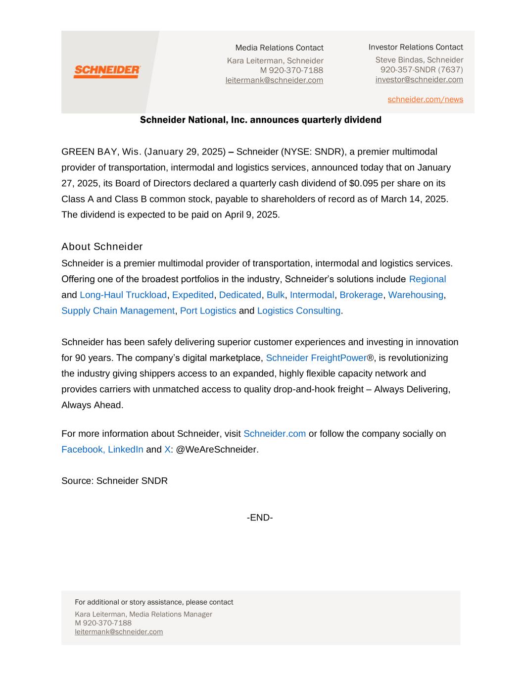 Media Relations Contact Kara Leiterman, Schneider M 920-370-7188 leitermank@schneider.com For additional or story assistance, please contact Kara Leiterman, Media Relations Manager M 920-370-7188 leitermank@schneider.com Investor Relations Contact Steve Bindas, Schneider 920-357-SNDR (7637) investor@schneider.com schneider.com/news Schneider National, Inc. announces quarterly dividend GREEN BAY, Wis. (January 29, 2025) – Schneider (NYSE: SNDR), a premier multimodal provider of transportation, intermodal and logistics services, announced today that on January 27, 2025, its Board of Directors declared a quarterly cash dividend of $0.095 per share on its Class A and Class B common stock, payable to shareholders of record as of March 14, 2025. The dividend is expected to be paid on April 9, 2025. About Schneider Schneider is a premier multimodal provider of transportation, intermodal and logistics services. Offering one of the broadest portfolios in the industry, Schneider’s solutions include Regional and Long-Haul Truckload, Expedited, Dedicated, Bulk, Intermodal, Brokerage, Warehousing, Supply Chain Management, Port Logistics and Logistics Consulting. Schneider has been safely delivering superior customer experiences and investing in innovation for 90 years. The company’s digital marketplace, Schneider FreightPower®, is revolutionizing the industry giving shippers access to an expanded, highly flexible capacity network and provides carriers with unmatched access to quality drop-and-hook freight – Always Delivering, Always Ahead. For more information about Schneider, visit Schneider.com or follow the company socially on Facebook, LinkedIn and X: @WeAreSchneider. Source: Schneider SNDR -END-