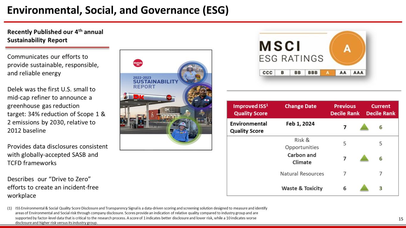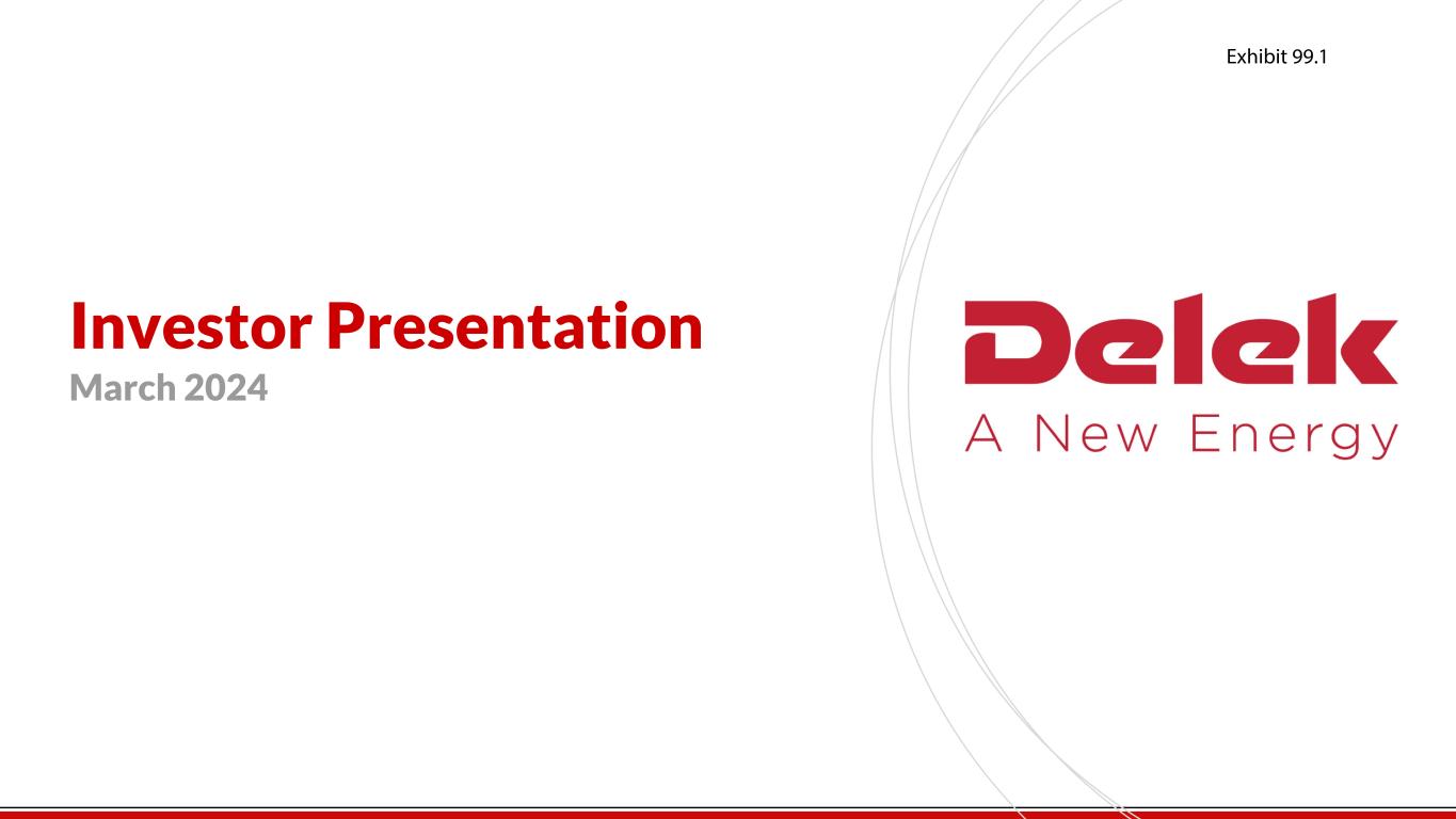 Delek Tech 3 Delek US Holdings Unlocking Value for Shareholders and Unitholders Financial Strength and Flexibility Integrated Downstream Energy Company (1) FactSet - 3/12/2024 Pricing Information. (2) Multiples based on sell-side research (Wells Fargo, TPH, Scotiabank, Raymond James, Piper Sandler) (3) DKL intends to use the net proceeds of approximately $132.5 million, after underwriting fees and commissions and before other offering related expenses, to repay outstanding borrowings under its revolving credit agreement. (4) DKL intends to use the net proceeds from the offering to (i) repurchase or redeem all of the outstanding 6.75% Senior Notes due 2025, (ii) repay in full the outstanding borrowings under DKL term loan facility and (iii) pay accrued and unpaid interest, premiums, fees and expenses related to such repurchases, repayments and redemptions. Delek US Holdings (DK) – $822.2 million of cash; $2,599.8 million long-term debt; $1.78 billion of net debt, as of December 31, 2023 Delek Logistics (DKL) – $3.8 million cash; $1,703.8 million long-term debt, as of December 31, 2023 Delek Logistics (DKL) – On March 12, 2024, closed an underwritten public offering of ~3.6 million common units for net proceeds $132.5 million(3). On March 13, 2024, closed on a private placement of $650 million of 8.625% Senior Notes due 2029(4). DK excluding DKL – $818.4 million cash;$896.0 million long-term debt, $77.6 million net debt, excluding DKL Refining – 302,000 BPD throughput capacity from four PADD 3 refineries with access to advantaged domestic, inland crudes and Gulf Coast product pricing Logistics – transportation, storage and wholesale distribution of crude oil, intermediate and refined products, primarily through Delek Logistics (DKL), a master limited partnership Retail – 250 convenience stores, primarily in West Texas and New Mexico Evaluating opportunities across Delek US business segments to unlock value for shareholders and unitholders As of the closing of DKL's underwritten offering on March, 12th 2024, Delek US owned 72.7% of DKL. An equity value of approximately $1.24 billion based on ~$39.00 per DKL unit(1) Alternatives to highlight Retail multiple of 6.5x - 10x(2)
