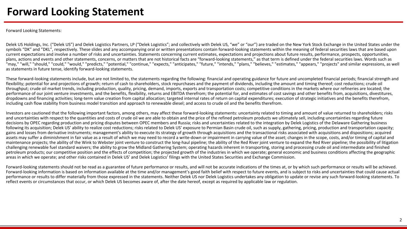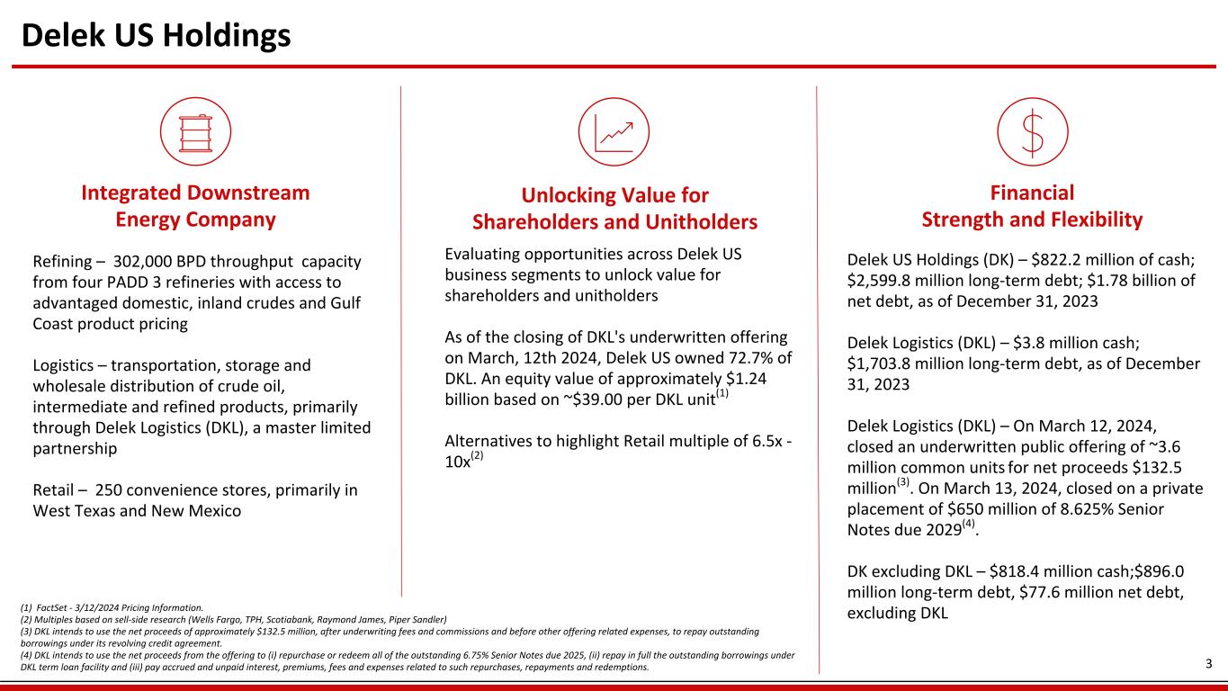 Delek Tech 2 Forward Looking Statement Forward Looking Statements: Delek US Holdings, Inc. (“Delek US”) and Delek Logistics Partners, LP (“Delek Logistics”; and collectively with Delek US, “we” or “our”) are traded on the New York Stock Exchange in the United States under the symbols “DK” and ”DKL”, respectively. These slides and any accompanying oral or written presentations contain forward-looking statements within the meaning of federal securities laws that are based upon current expectations and involve a number of risks and uncertainties. Statements concerning current estimates, expectations and projections about future results, performance, prospects, opportunities, plans, actions and events and other statements, concerns, or matters that are not historical facts are “forward-looking statements,” as that term is defined under the federal securities laws. Words such as "may," "will," "should," "could," "would," "predicts," "potential," "continue," "expects," "anticipates," "future," "intends," "plans," "believes," "estimates," "appears," "projects" and similar expressions, as well as statements in future tense, identify forward-looking statements. These forward-looking statements include, but are not limited to, the statements regarding the following: financial and operating guidance for future and uncompleted financial periods; financial strength and flexibility; potential for and projections of growth; return of cash to shareholders, stock repurchases and the payment of dividends, including the amount and timing thereof; cost reductions; crude oil throughput; crude oil market trends, including production, quality, pricing, demand, imports, exports and transportation costs; competitive conditions in the markets where our refineries are located; the performance of our joint venture investments, and the benefits, flexibility, returns and EBITDA therefrom; the potential for, and estimates of cost savings and other benefits from, acquisitions, divestitures, dropdowns and financing activities; long-term value creation from capital allocation; targeted internal rates of return on capital expenditures; execution of strategic initiatives and the benefits therefrom, including cash flow stability from business model transition and approach to renewable diesel; and access to crude oil and the benefits therefrom. Investors are cautioned that the following important factors, among others, may affect these forward-looking statements: uncertainty related to timing and amount of value returned to shareholders; risks and uncertainties with respect to the quantities and costs of crude oil we are able to obtain and the price of the refined petroleum products we ultimately sell, including uncertainties regarding future decisions by OPEC regarding production and pricing disputes between OPEC members and Russia; risks and uncertainties related to the integration by Delek Logistics of the Delaware Gathering business following its acquisition; Delek US’ ability to realize cost reductions; risks related to Delek US’ exposure to Permian Basin crude oil, such as supply, gathering, pricing, production and transportation capacity; gains and losses from derivative instruments; management's ability to execute its strategy of growth through acquisitions and the transactional risks associated with acquisitions and dispositions; acquired assets may suffer a diminishment in fair value as a result of which we may need to record a write-down or impairment in carrying value of the asset; changes in the scope, costs, and/or timing of capital and maintenance projects; the ability of the Wink to Webster joint venture to construct the long-haul pipeline; the ability of the Red River joint venture to expand the Red River pipeline; the possibility of litigation challenging renewable fuel standard waivers; the ability to grow the Midland Gathering System; operating hazards inherent in transporting, storing and processing crude oil and intermediate and finished petroleum products; our competitive position and the effects of competition; the projected growth of the industries in which we operate; general economic and business conditions affecting the geographic areas in which we operate; and other risks contained in Delek US’ and Delek Logistics’ filings with the United States Securities and Exchange Commission. Forward-looking statements should not be read as a guarantee of future performance or results, and will not be accurate indications of the times at, or by which such performance or results will be achieved. Forward-looking information is based on information available at the time and/or management’s good faith belief with respect to future events, and is subject to risks and uncertainties that could cause actual performance or results to differ materially from those expressed in the statements. Neither Delek US nor Delek Logistics undertakes any obligation to update or revise any such forward-looking statements. To reflect events or circumstances that occur, or which Delek US becomes aware of, after the date hereof, except as required by applicable law or regulation.