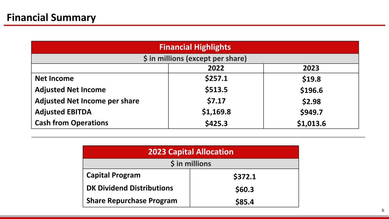 Financial Summary Financial Highlights $ in millions (except per share) 2022 2023 Net Income $257.1 $19.8 Adjusted Net Income $513.5 $196.6 Adjusted Net Income per share $7.17 $2.98 Adjusted EBITDA $1,169.8 $949.7 Cash from Operations $425.3 $1,013.6 2023 Capital Allocation $ in millions Capital Program $372.1 DK Dividend Distributions $60.3 Share Repurchase Program $85.4 6